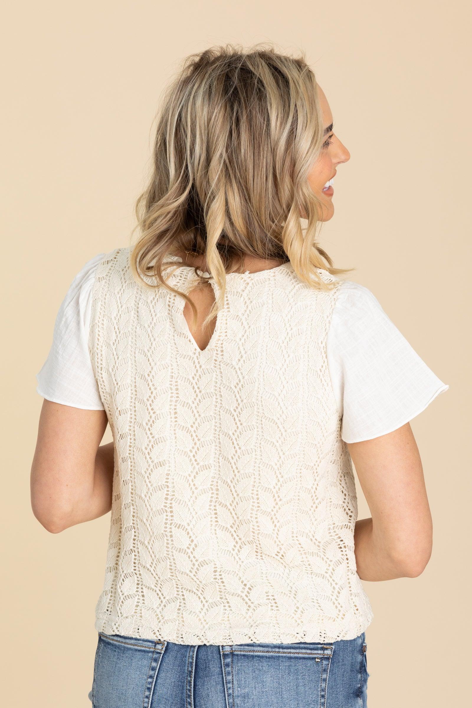 Product Details Colors: Ivory, Off White Print: Two Tone Neckline: Round Sleeve: Short Sleeve Hemline: Straight Brand: Hayden Material and Care 65% Cotton 35% Polyester Hand Wash Cold Hang/Line Dry Size and Fit Small: Bust 34" Waist 34" Length 20" Medium: Bust 36" Waist 36" Length 21" Large: Bust 38" Waist 38" Length 22" Sarah is 5’8” and wearing her true size small