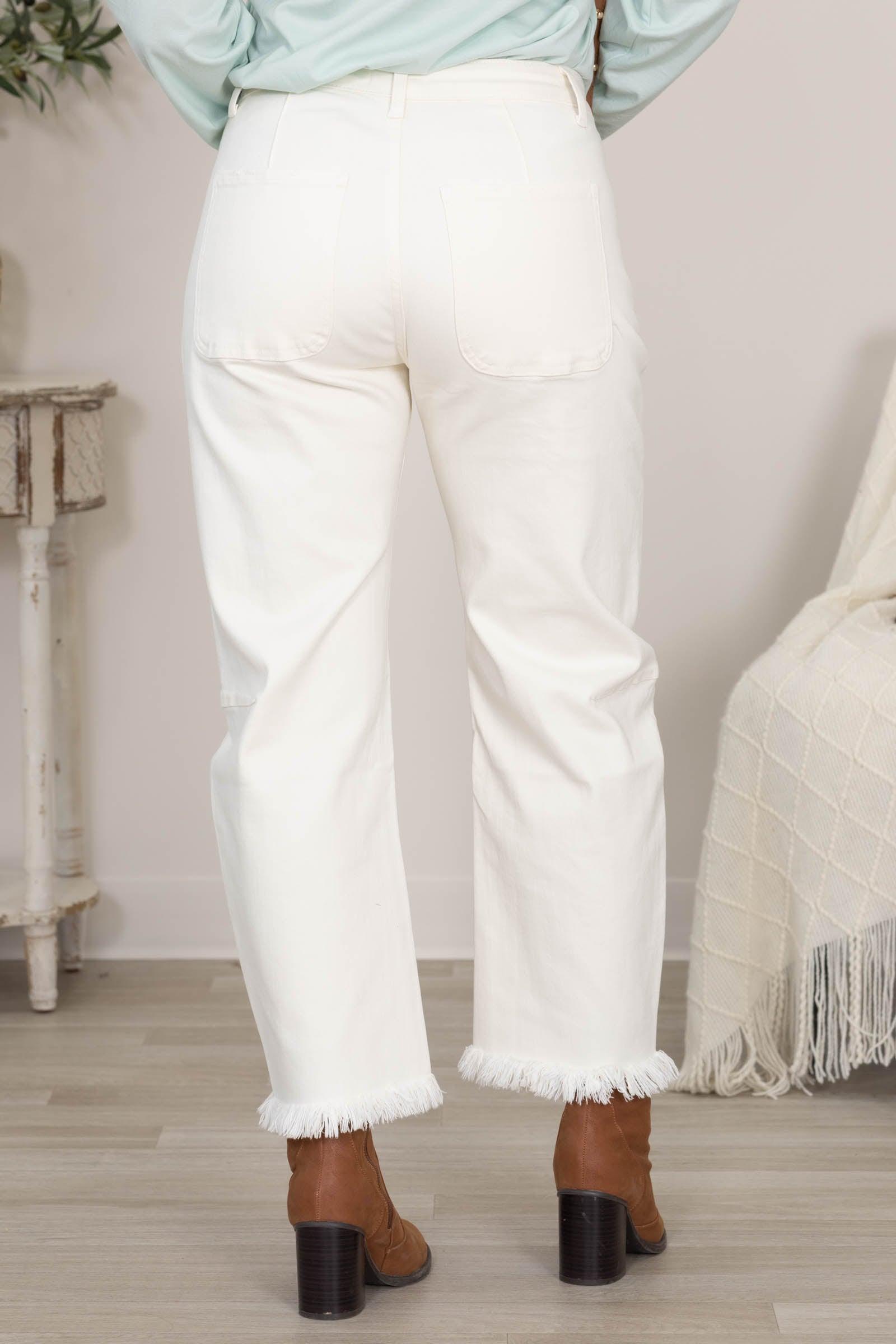 Product Details Color/Wash: Ivory Rise: High Rise Style: Slim Barrel Leg Jeans Brand: Anniewear Material and Care 93% Cotton 6% Polyester 1% Spandex Hand Wash Cold Hang/Line Dry Size and Fit Small: Waist 26" Rise 10.5" Inseam 26" Medium: Waist 28" Rise 11" Inseam 26" Large: Waist 30" Rise 11.5" Inseam 26" X Large: Waist 32" Rise 12" Inseam 26.5" Erica is 5'7 and wearing a size medium