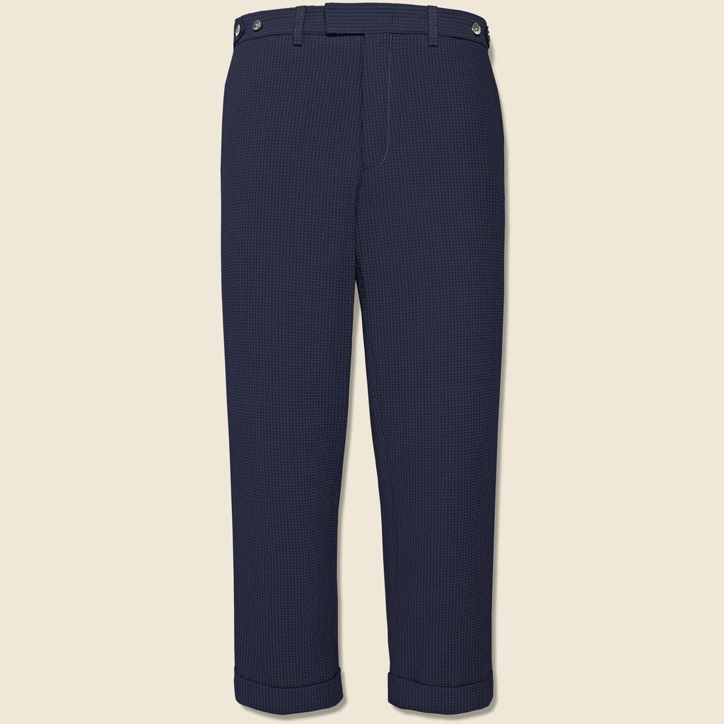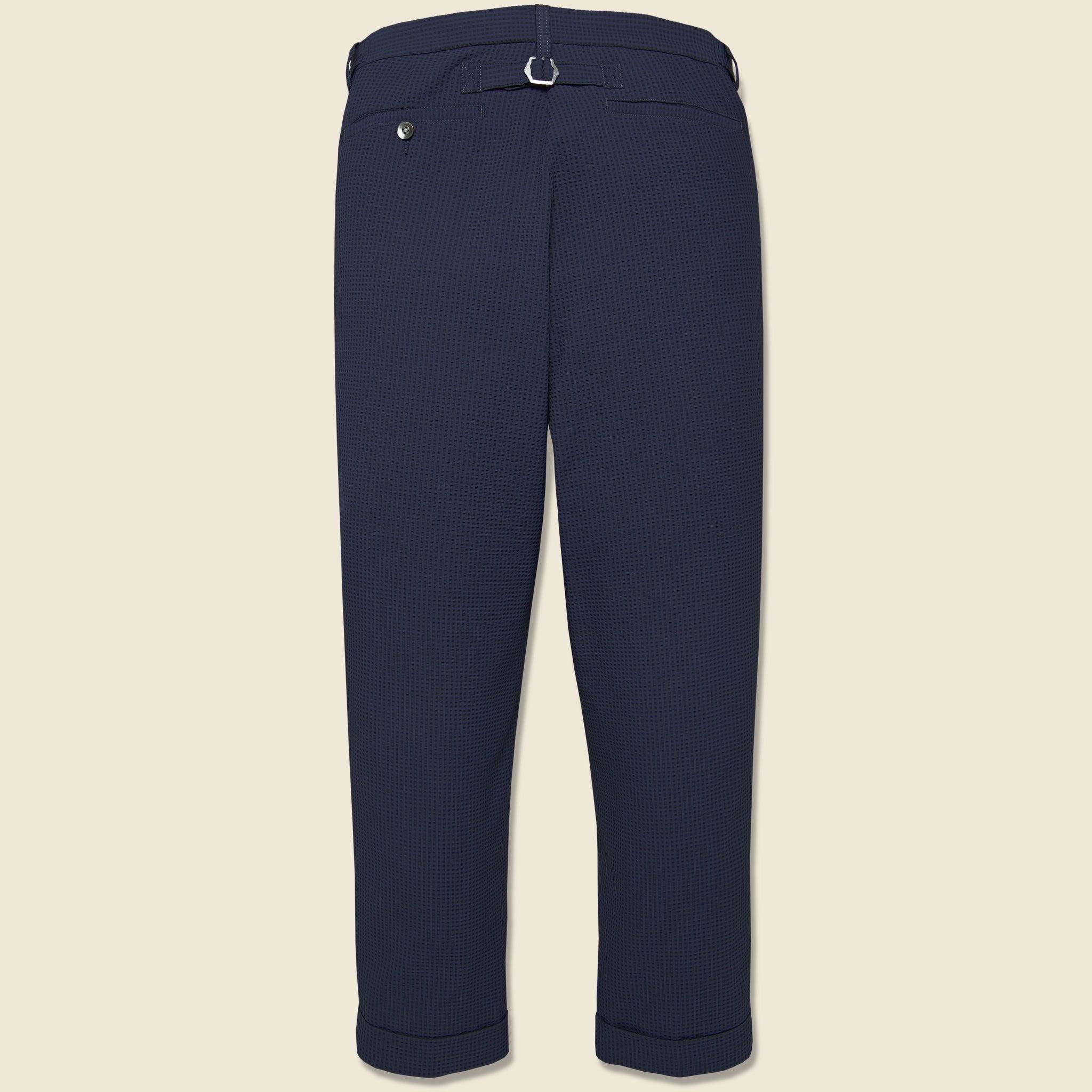 These Ivy Trousers from Beams + are cut from a lightweight, breathable cotton-blend seersucker that has an incredible texture and is the perfect weight for warmer days. Tailored with an easygoing, relaxed fit that runs true to size and detailed with front button cinch tabs, a back-cinch tab, two side pockets, two welt back pockets, and a cropped hem with a turned-up cuff for a classic finish. Pair with the 3B Seersucker Sport Jacket to complete the look.