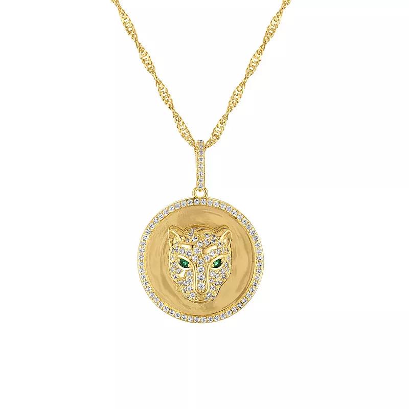 Accessorize in style with this Ivy Sharpe 14k gold plated cubic zirconia panther pendant necklace. Click on this JEWELRY & WATCHES GUIDE to learn about fit, styles, materials and more! Accessorize in style with this Ivy Sharpe 14k gold plated cubic zirconia panther pendant necklace. Click on this JEWELRY & WATCHES GUIDE to learn about fit, styles, materials and more! FEATURES Pendant size: 33.25 mm x 23 mm Chain length: 18 in. Chain type: Singapore Clasp: lobster-claw Nickel free Metal: brass Plating: 14k gold Finish: polished Packaging: boxedSTONE DETAILS Stone type: cubic zirconia Total weight: 1 1/2 ct. Shape: round Setting: prong Gemstones may have been treated to enhance their appearance. Special care may be required. Please visit our Gemstone Treatment & Special Care Guide for more information. Size: 18. Color: Gold Tone. Gender: female. Age Group: adult.