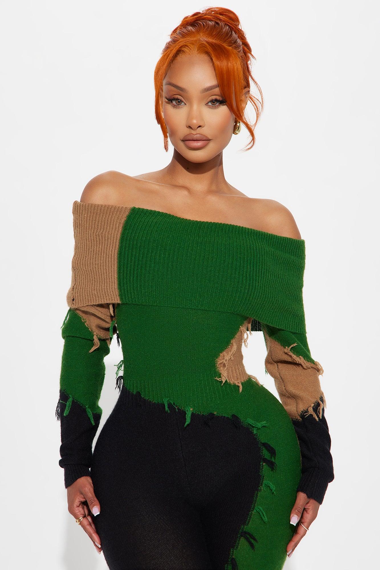 Available In Green/combo. Sweater Jumpsuit Long Sleeve Off Shoulder Distressed Skinny Leg Stretch 55% Viscose 27% Polyester 18% Nylon Imported
