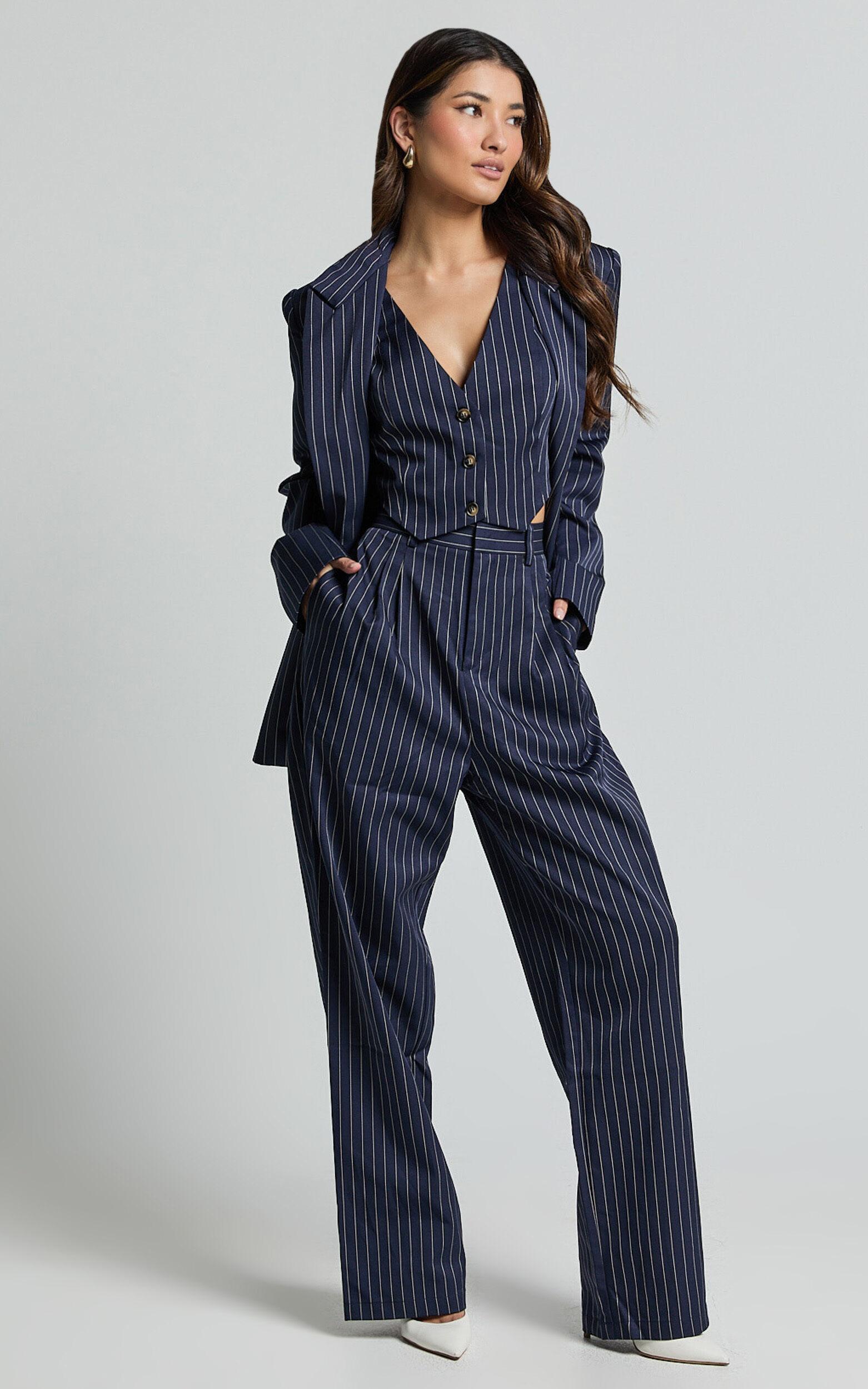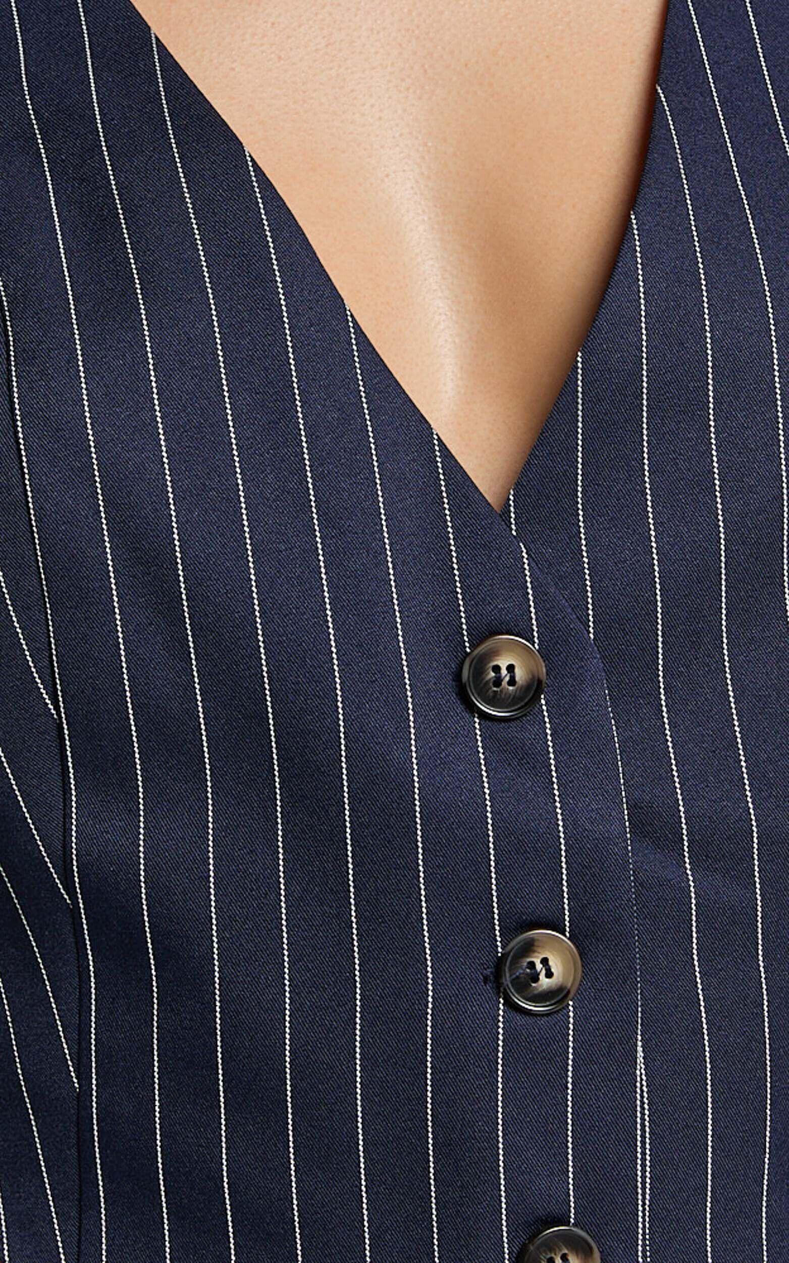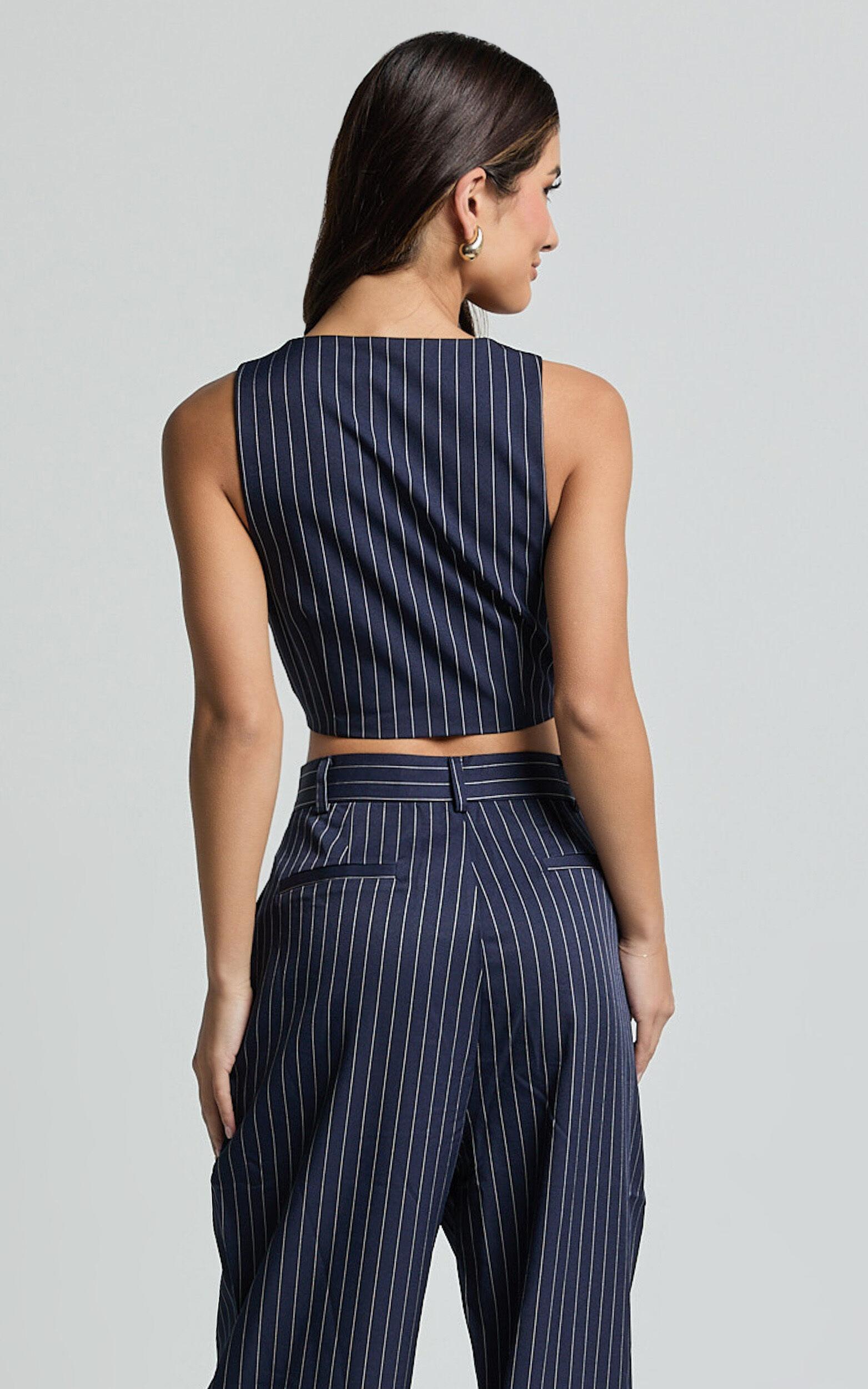Elevate your wardrobe with the Iyah Top - a game-changer in chic workwear and everyday styling. This trendy V Neck Button Up Cropped Vest is an ode to modern tailoring, featuring a sophisticated Navy Pinstripe design that screams confidence and elegance. Fashioned from high-quality twill polyester, this top combines durability with sleek aesthetics, making it a staple for any fashion-forward enthusiast.Product Details:Buttons detailFashion TopsTwill fabricV NeckWorkwear appropriateCrop lengthSleevelessPolyester material.Size and FitSize S / 8 length: 45.5cm / 17.91inMaterial and Care100% PolyesterLow / No stretch