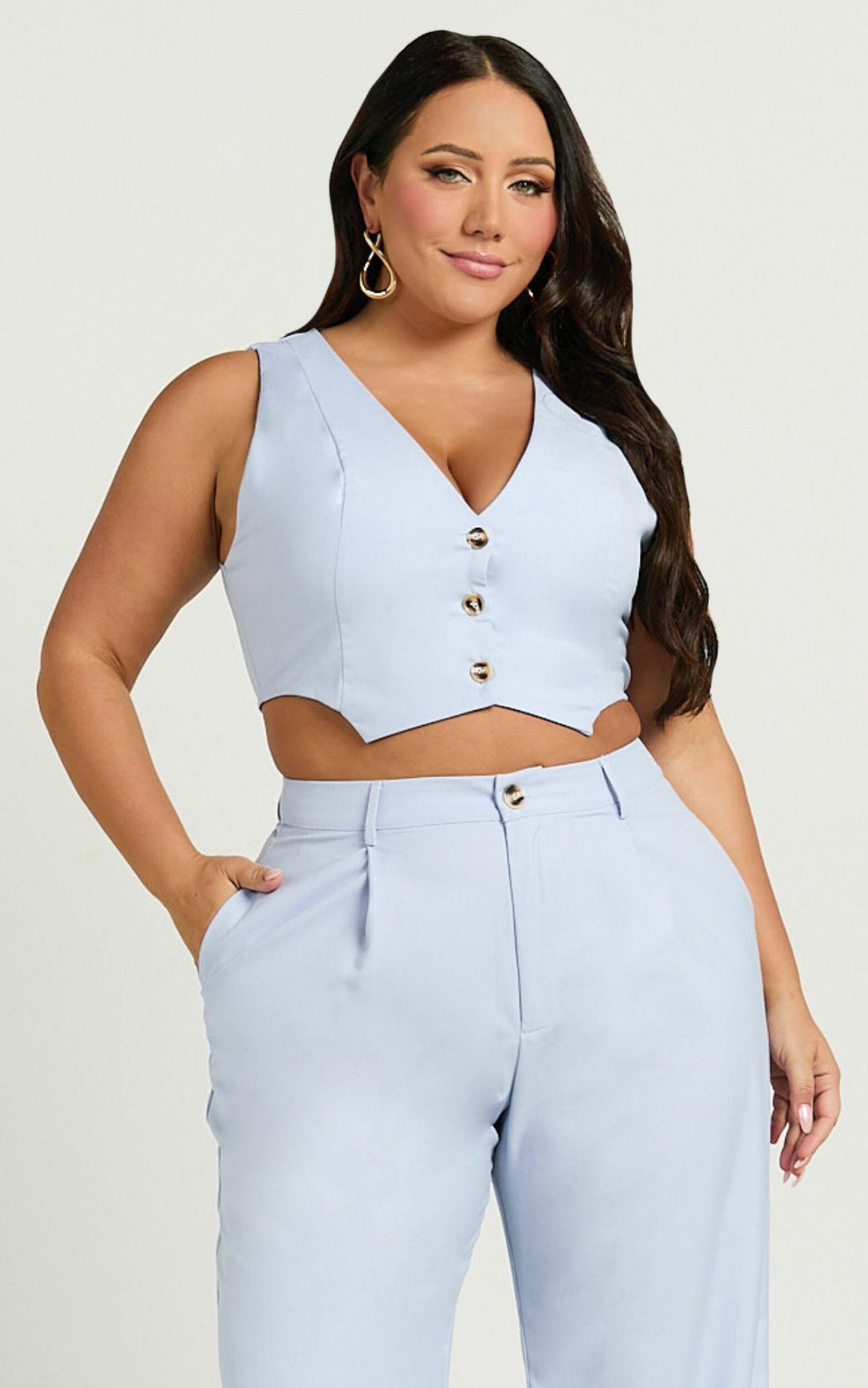 Get ready to turn heads in the Izara Vest - your new go-to piece that perfectly marries casual chic with workwear sophistication. This V Neck Button Up Cropped Vest in Light Blue is more than just an item; it's a statement. Designed with the modern fashionista in mind, it's the epitome of trendy and fashion-forward.Product Details:Fashion TopsMid Weight WovenV NeckCasual, WorkwearCrop LengthSleevelessSummer SeasonPolyester MaterialSize and FitSize S / 8 length: 45.5cm / 17.91inMaterial and CareMain Fabric: 95% Polyester, 5% SpandexLow / No stretch
