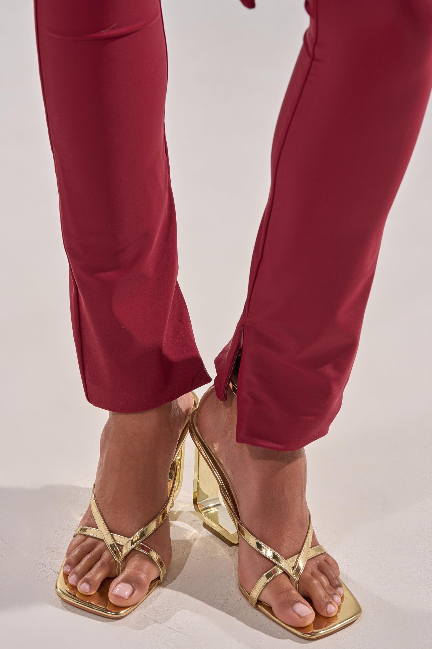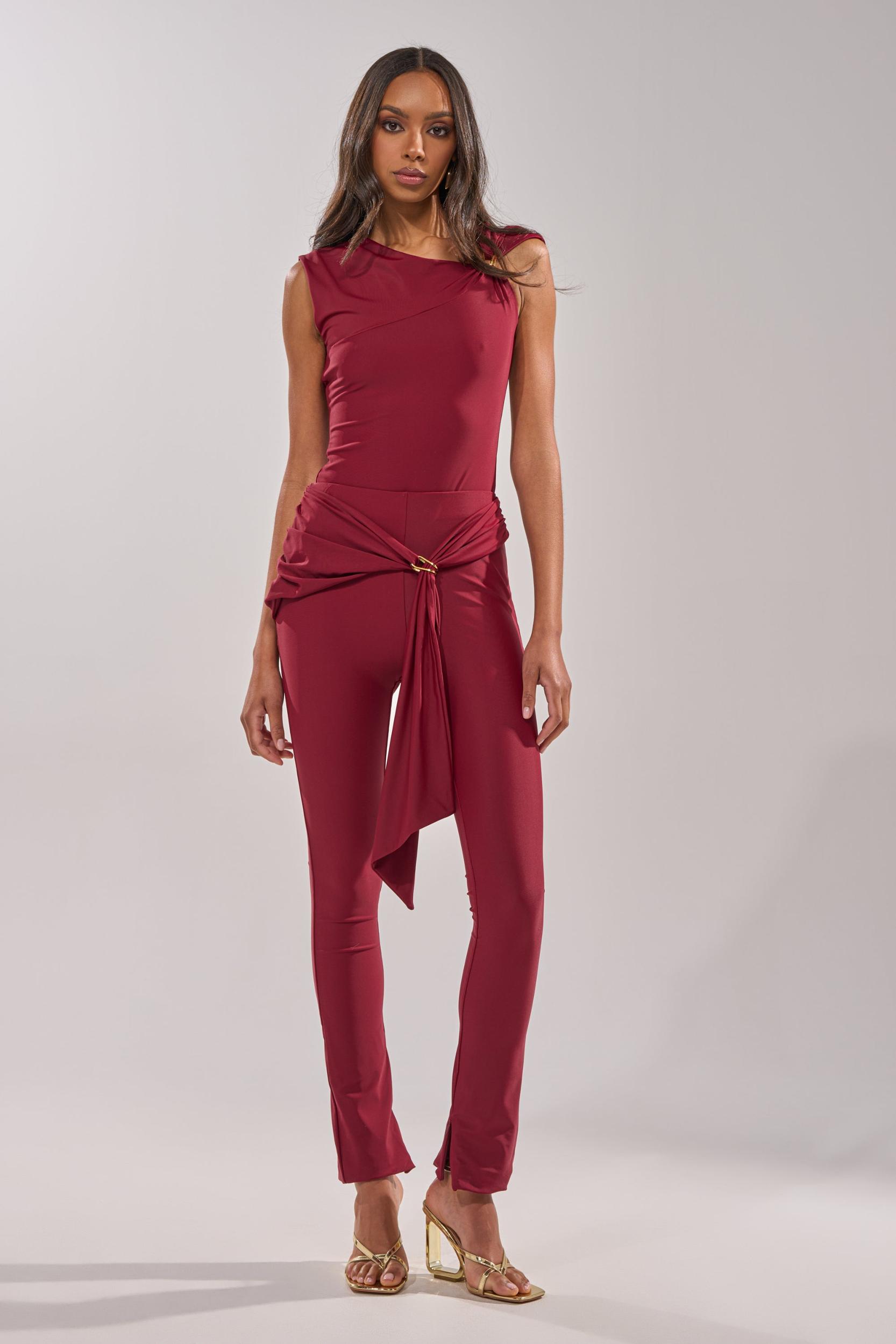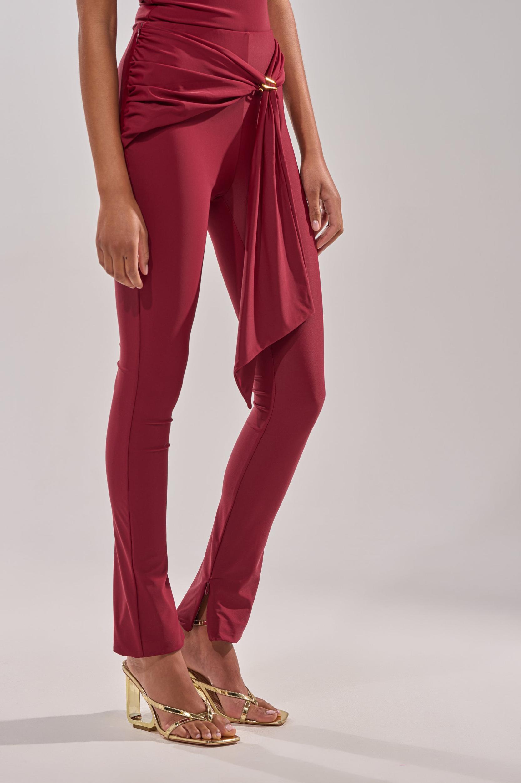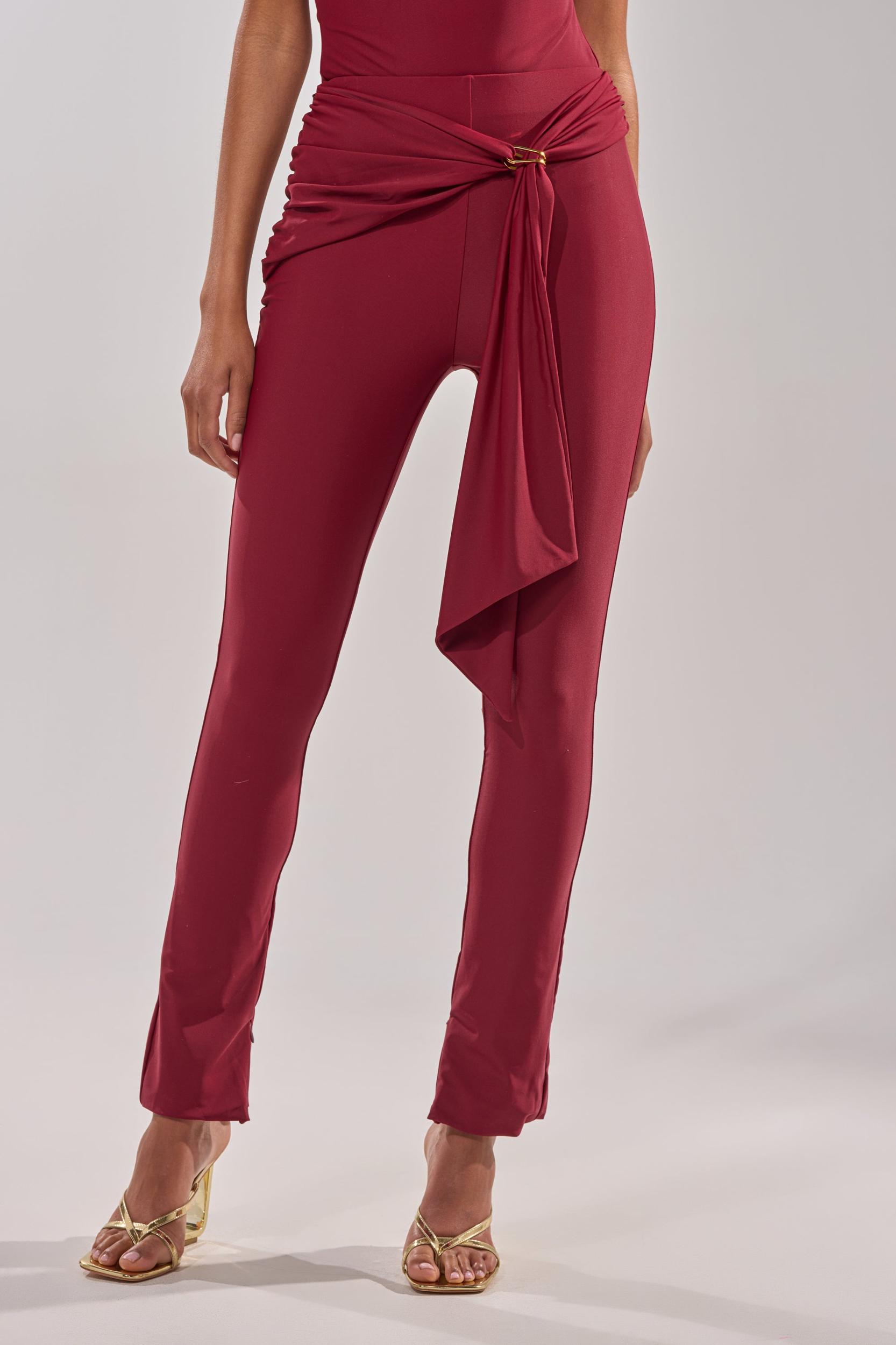 Maroon never looked so good with the AKIRA Label Izzy Seamless Legging in Burgundy! These stylish pants feature a sleek, body-hugging fit with a hidden side zipper enclosure paired with a draped overlay that wraps gracefully around the waist, secured by a chic gold accent clasp for added sophistication. Designed with a soft, stretchy fabric and subtle flare at the hem with bottom zippers for extra flare, they blend comfort with high-fashion appeal. Style with the coordinating AKIRA Label Izzy Seamless Bodysuit in Burgundy for a red-hot matching set! - 95% Polyester 5% Spandex- Hand Wash or Dry Clean Only- Super Stretchy- Imported (all measurements are approximate from size small)- 10” Rise- 31” Inseam- Model is 5’10” and wearing size smallProduct ID: 1073915 (all measurements are approximate from size 1X)- 14” Rise- 32” InseamProduct ID: 1073919