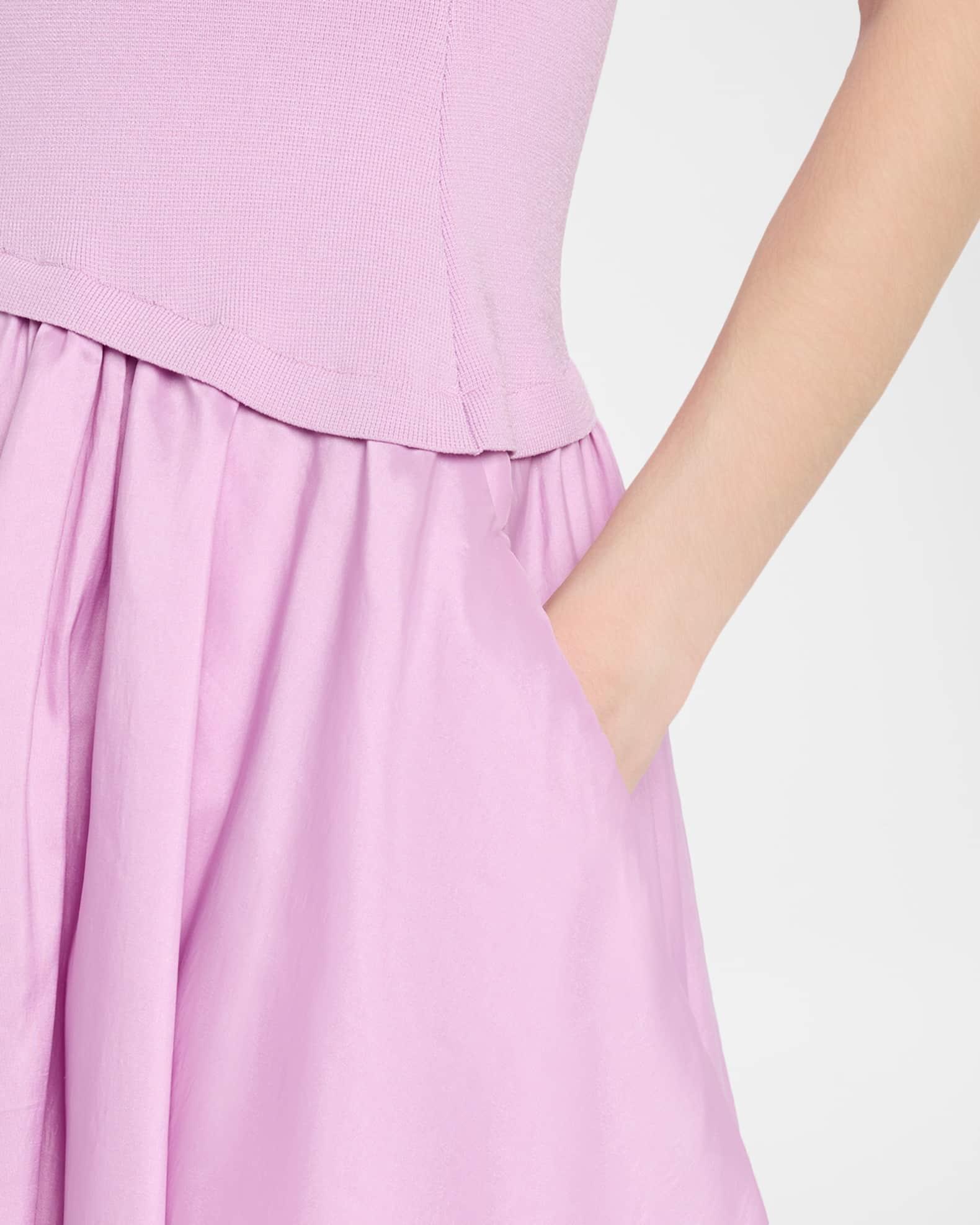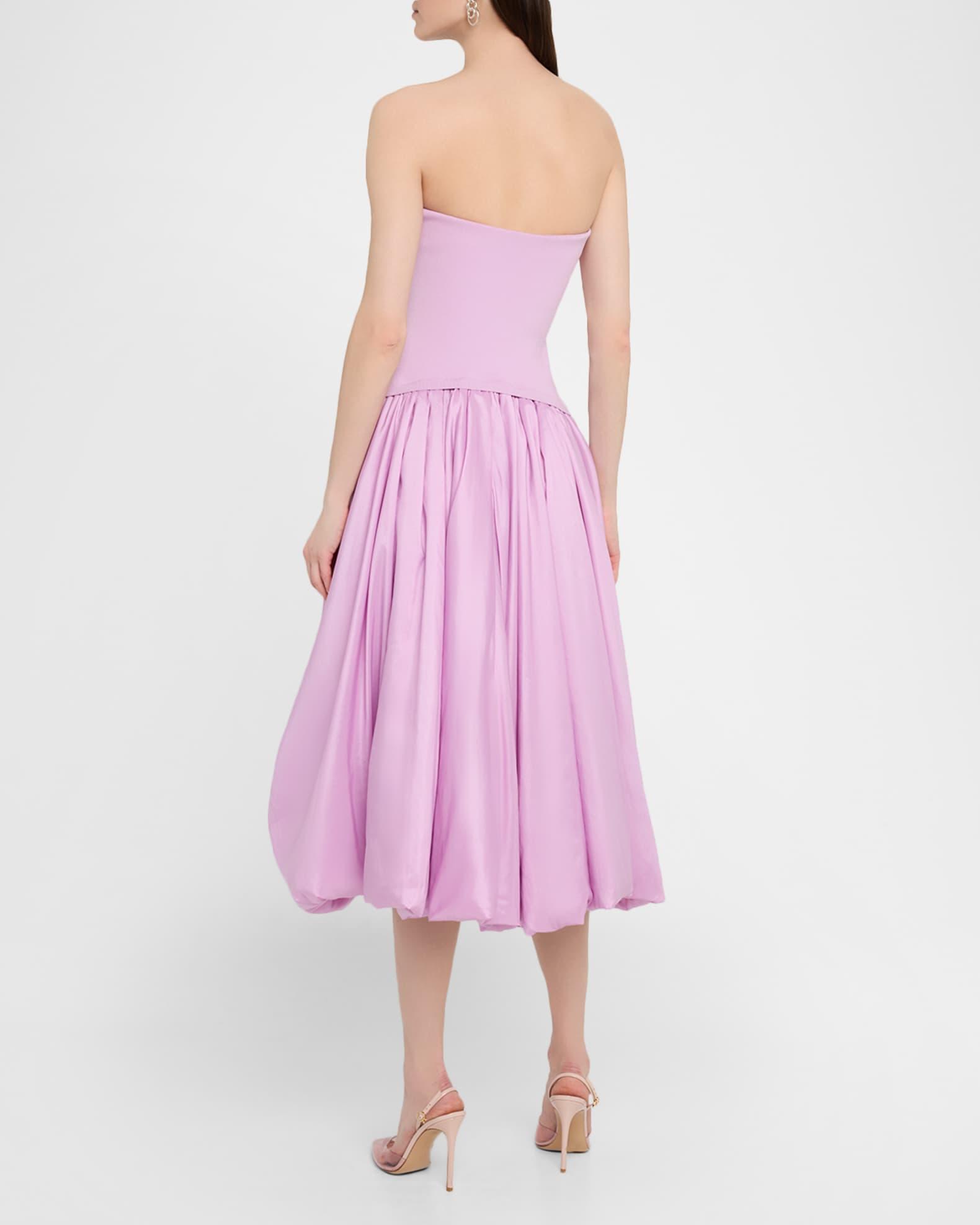 Crafted with a youthful flair, the "Izzy" midi dress from SIMKHAI is constructed with a knit bodice and structured taffeta bubble skirt Strapless neckline Sleeveless On-seam pockets Hem falls below the knee A-line silhouette Slipover style Viscose/elastane Dry clean Imported