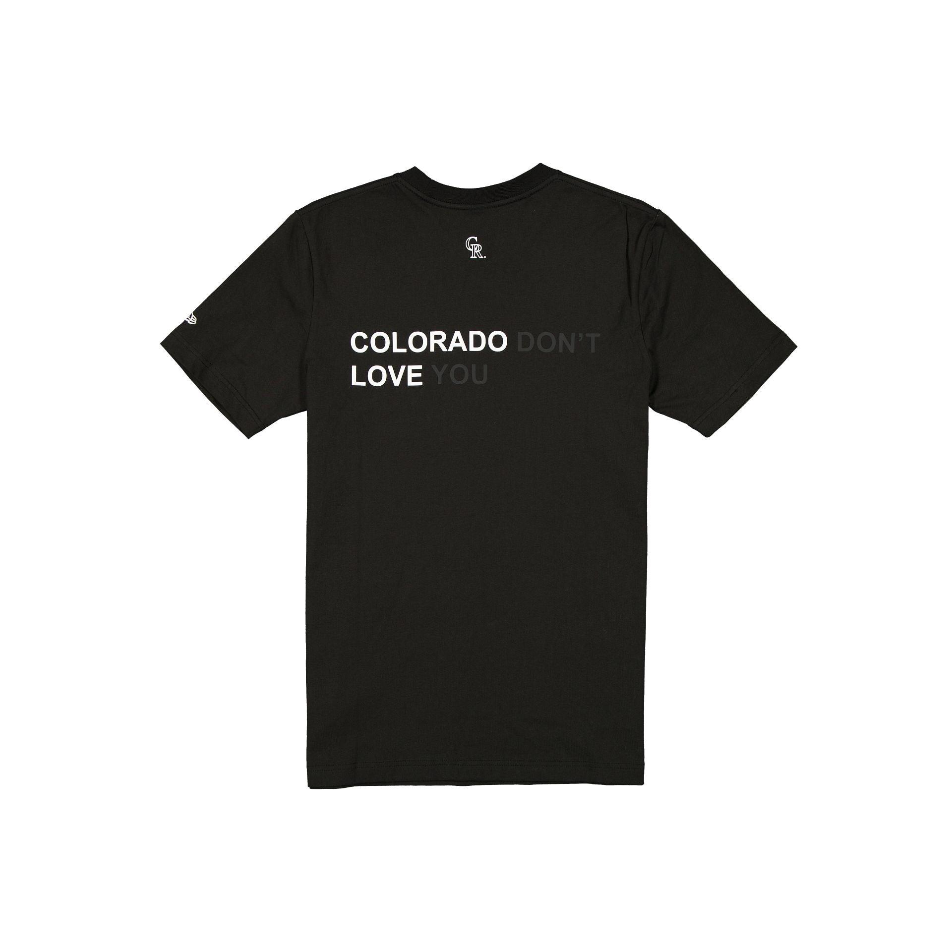The J-Frost x Colorado Rockies Black T-Shirt features a screen-printed Rockies logo at the left chest with a Colorado Don't Love You wordmark and team logo at the rear.Fabric: 100% Cotton