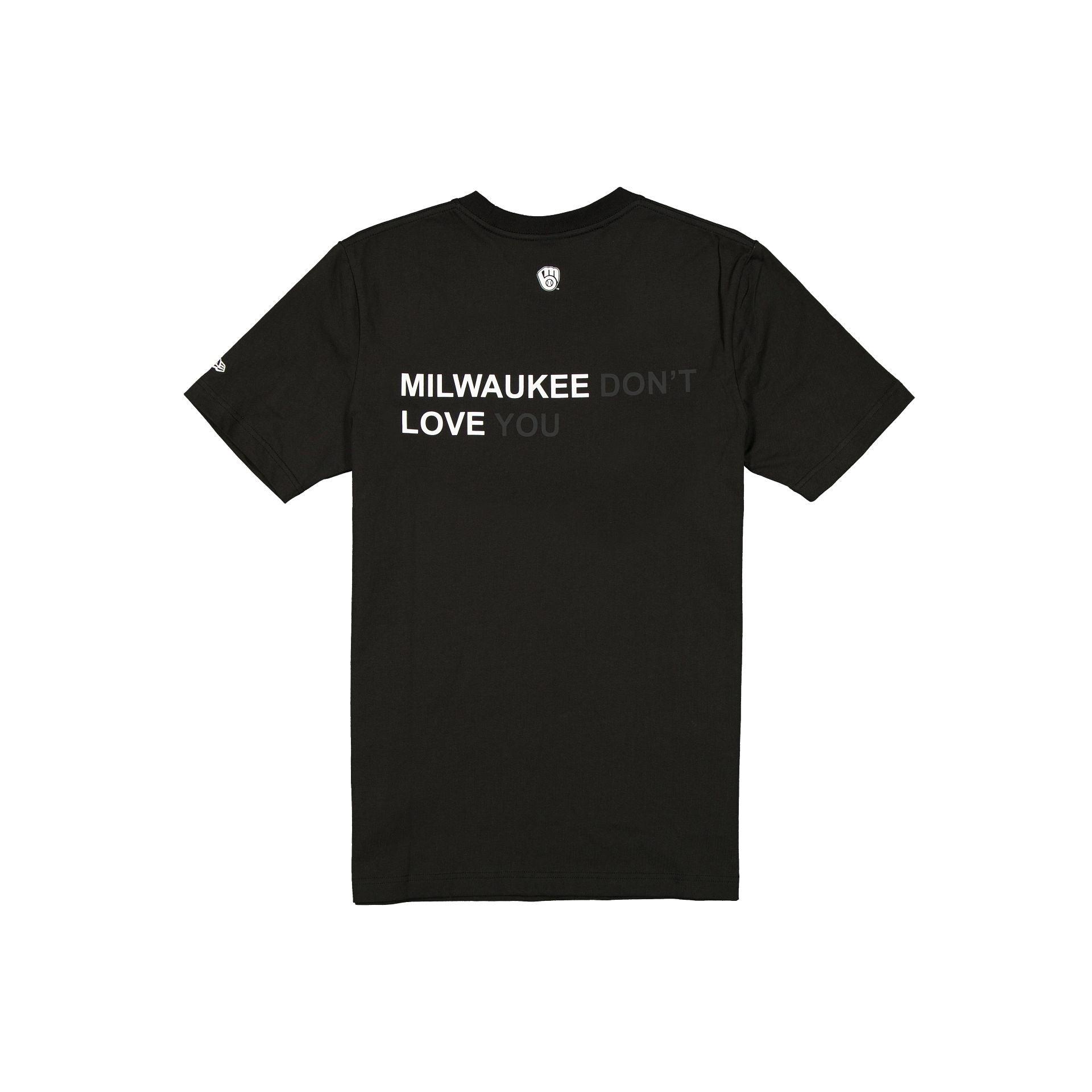 The J-Frost x Milwaukee Brewers Black T-Shirt features a screen-printed Brewers logo at the left chest with a Milwaukee Don't Love You wordmark and team logo at the rear.Fabric: 100% Cotton