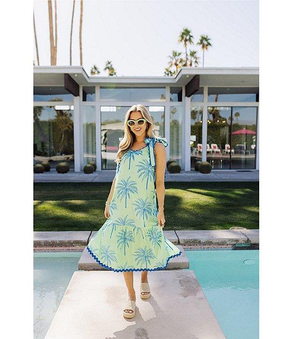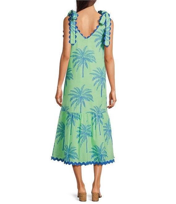 J.Marie Isla Topical Palm Print Ric Rac Scalloped Trim V-Neck Sleeveless Tie A-Line Midi Dress