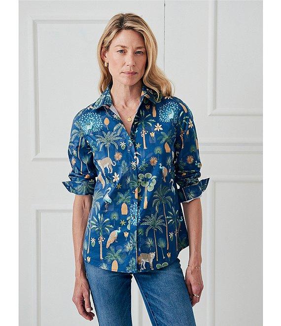 From J.McLaughlin, this blouse features: Printed woven fabrication Slightly relaxed Point collar neckline Long sleeves with button cuffs Shirttail hem Button front closure Approx. 27" length Cotton Machine wash Imported.