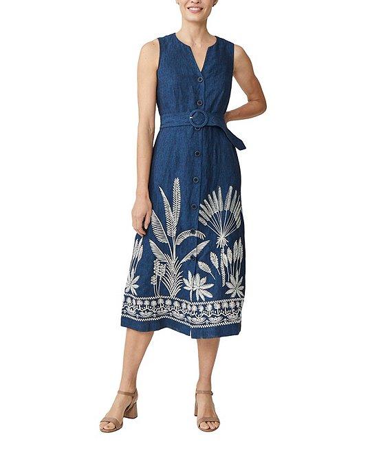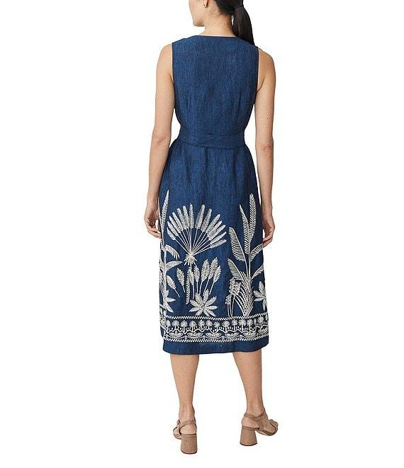J.McLaughlin Margarette Linen Floral Embroidered Split V-Neck Sleeveless Midi Dress