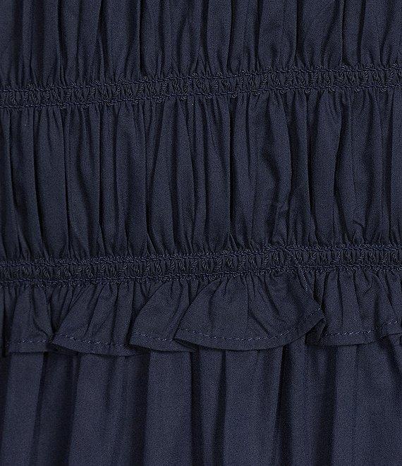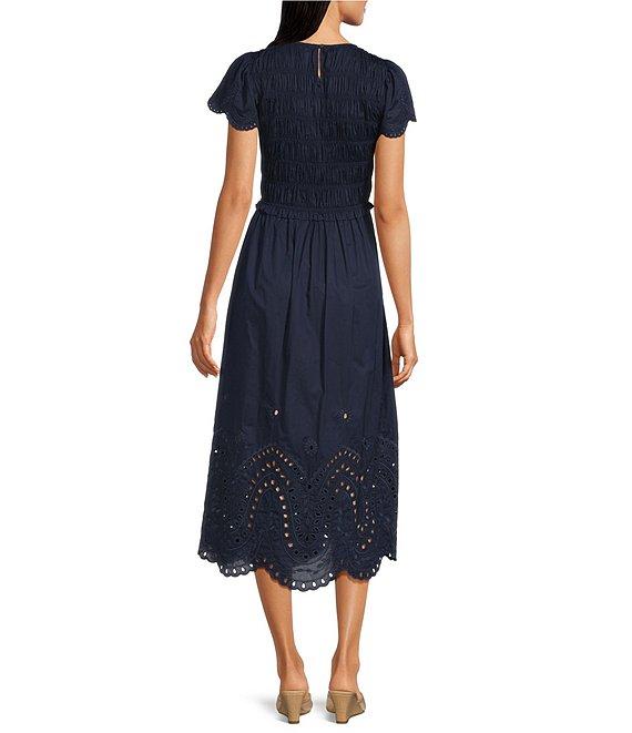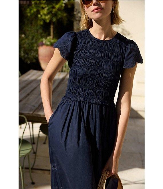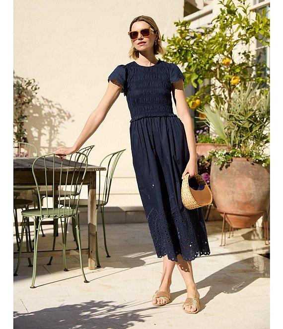 From J.McLaughlin, this dress features: Woven fabrication Smocked bodice Round neckline Ruffle cap sleeves Side pockets Eyelet skirt Scallop hem Pullover constructionBack button loop closure Approx. 50" length Cotton Machine wash / line dry Imported.