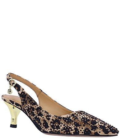 From J. Renee, the Ferryanne Rhinestone Fabric Leopard Kitten Heel Slingback Pumps feature:Rhinestone covered fabric upperAdjustable buckled sling strap closureSynthetic liningMemory foam insole for added cushion and comfortSynthetic outsoleapprox. 2 kitten heelImported.