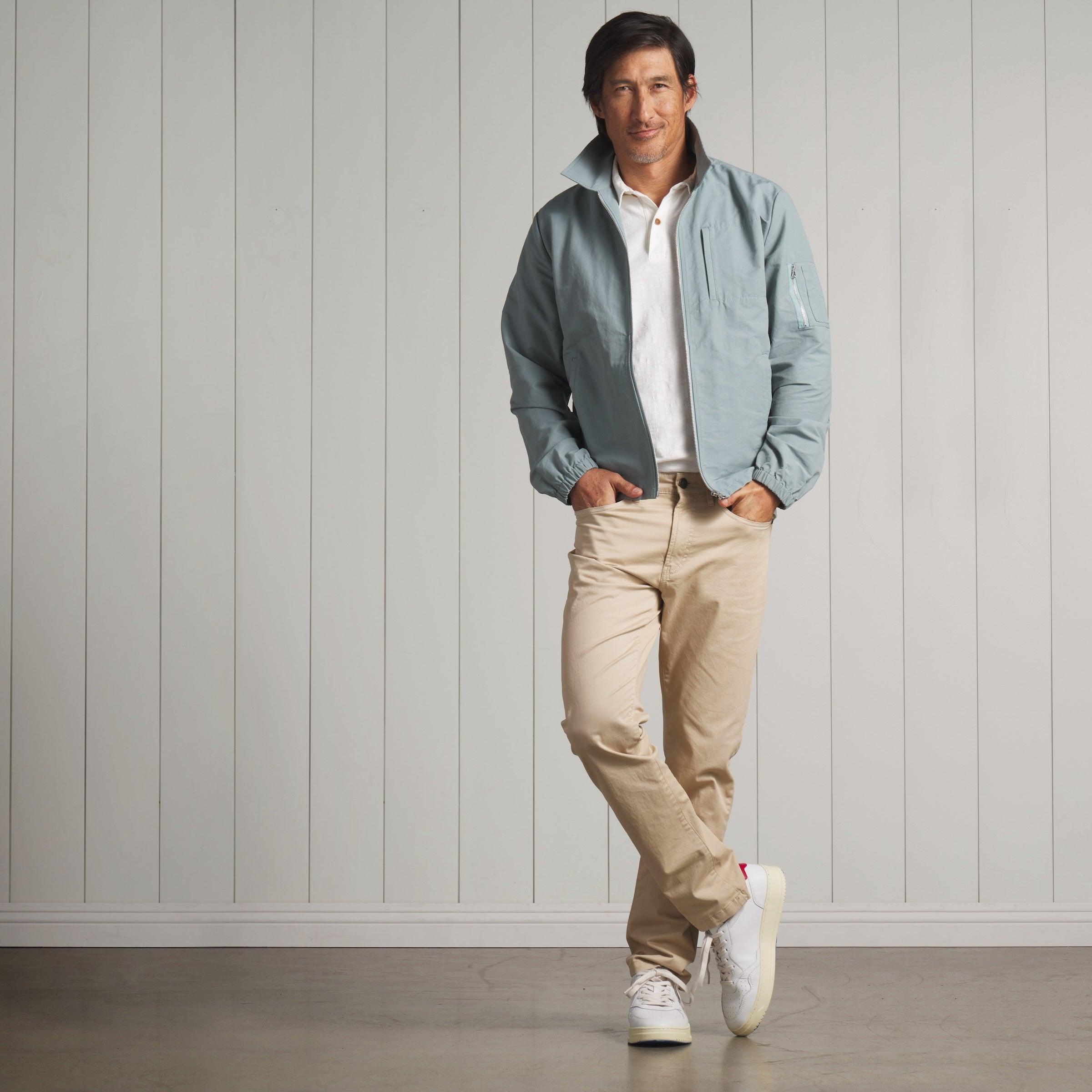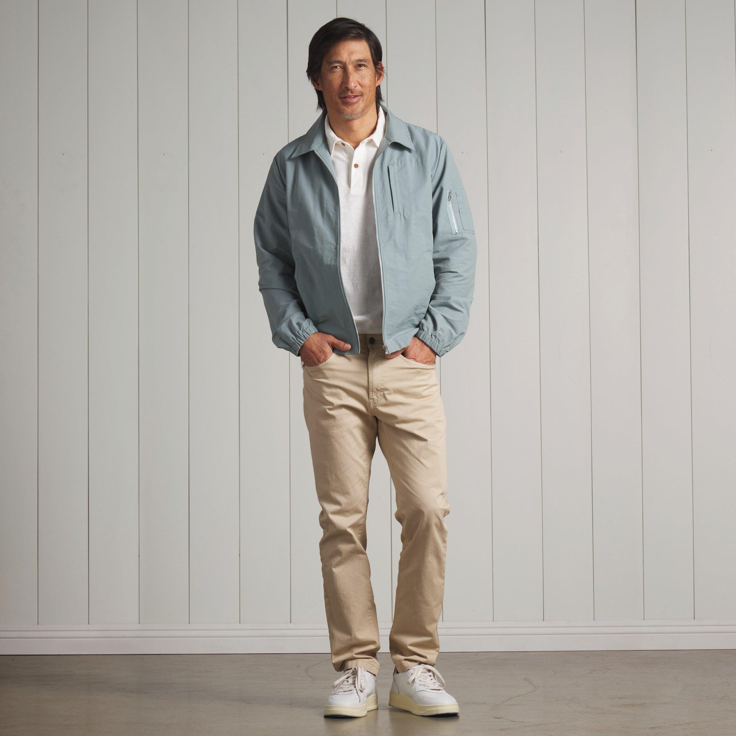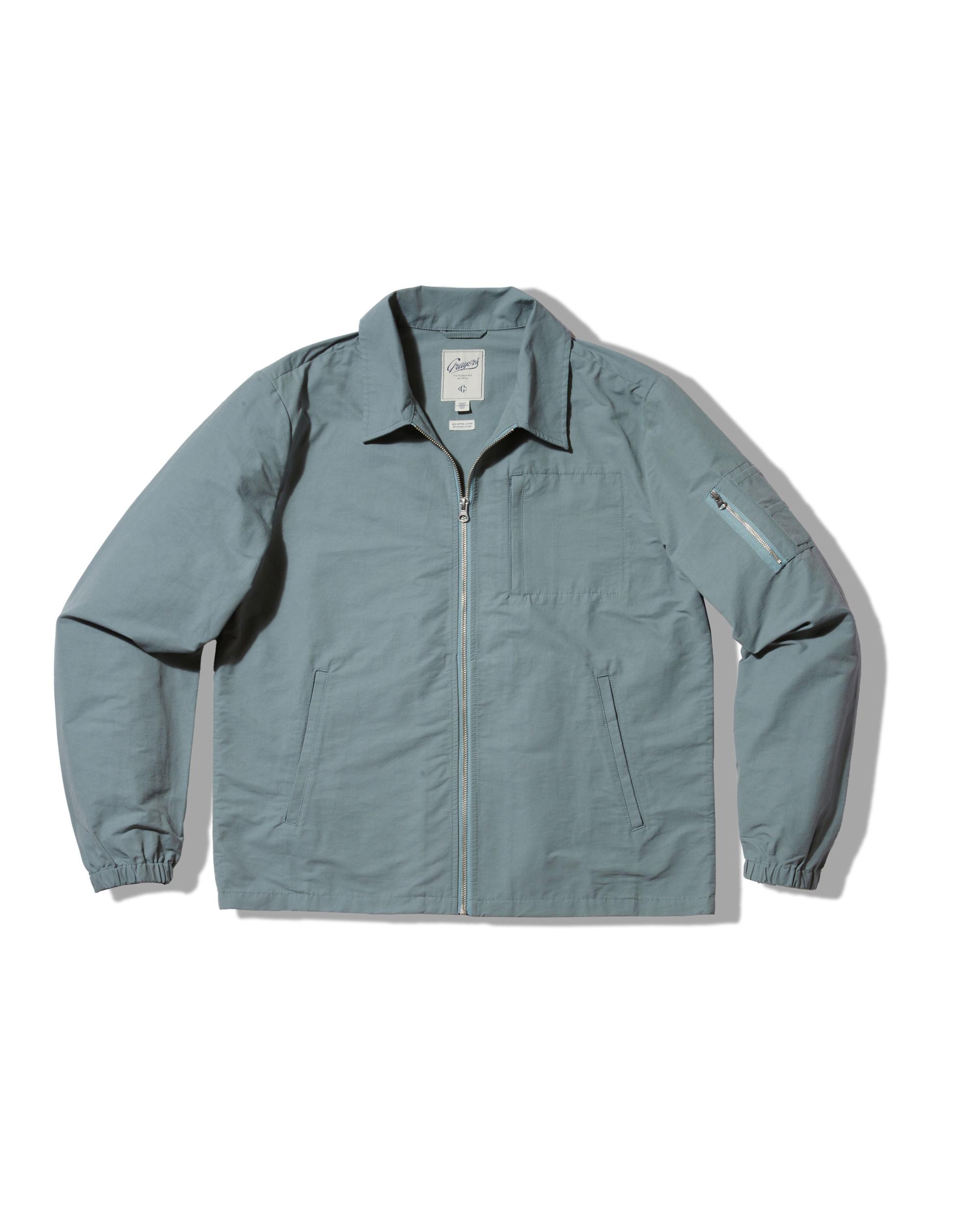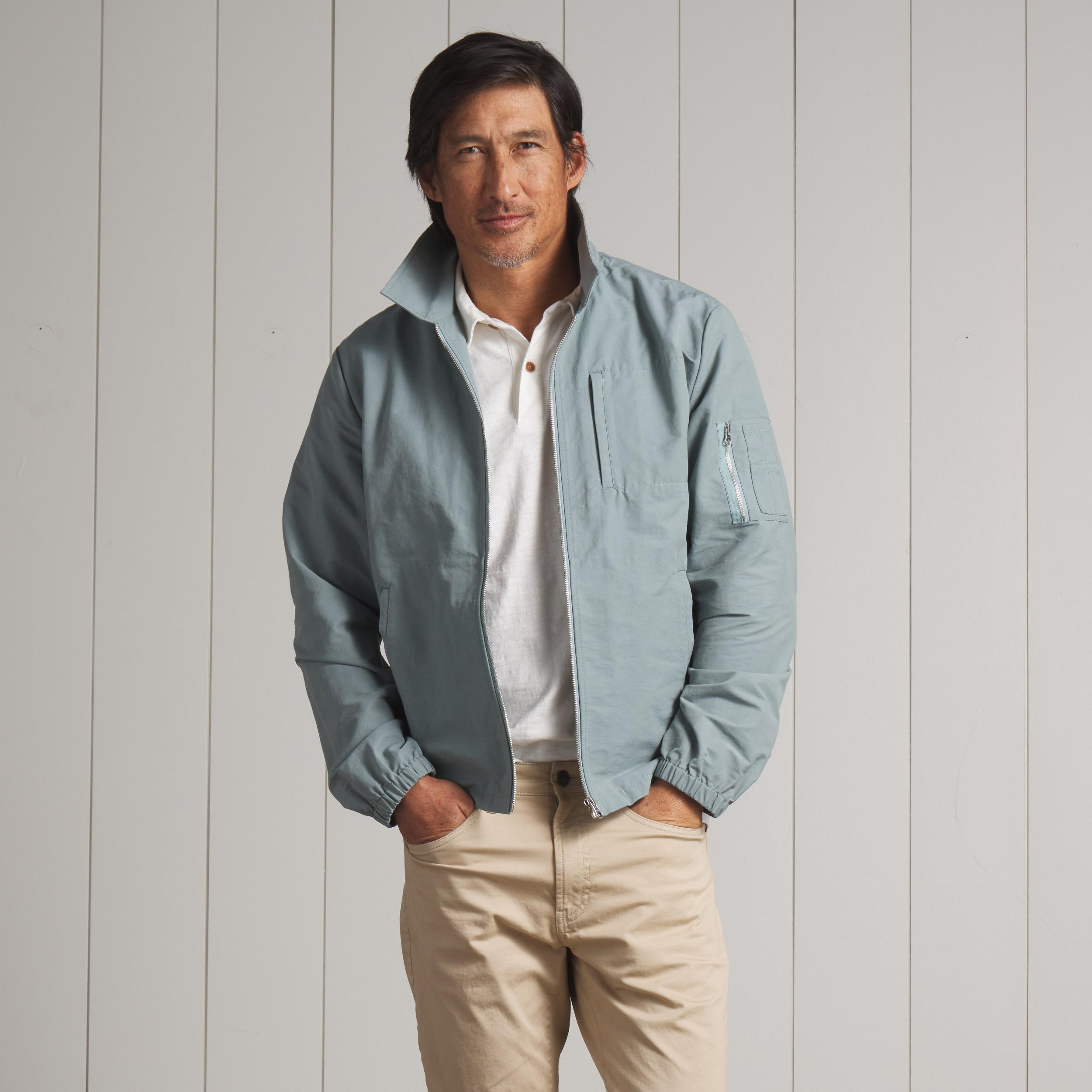Old school. Back to basics. This livable essential will stave off the chill of the early morning or counter the wind on an evening beach stroll. The perfect antidote for the unpredictable weather of spring, the classic windbreaker is inspired by the iconic all-American zip front light weight jacket. The shell fabric is a compact blend of cotton and nylon, delivering a crisp hand and a fair fight against the wind. The Model is also wearing: Sunwashed 2 Button Polo - White and Alternative Stretch Slim Fit 5 Pocket - Pebble. Model: Adrian is wearing size medium and is 6'. ----Details---- Spread collar 2 welt pockets Left sleeve zip pocket Left chest zip pocket Elasticized cuffs Internal pockets Piped seams Zip front ----Materials---- 68% Cotton 32% Nylon ----Size & Fit---- Measuring Method: All measurements are in inches and based on a flat garment, as shown below. For comparison with one of your existing garments, please lay garment on a flat surface and follow the key measurement points. For chest and neck, if you double the flat measurement, you will get close to the full body measurement. ----Care---- Machine Wash Cold Separately Do Not Soak Before Washing Do Not Bleach Remove Promptly Tumble Dry Low Cool Iron if Necessary