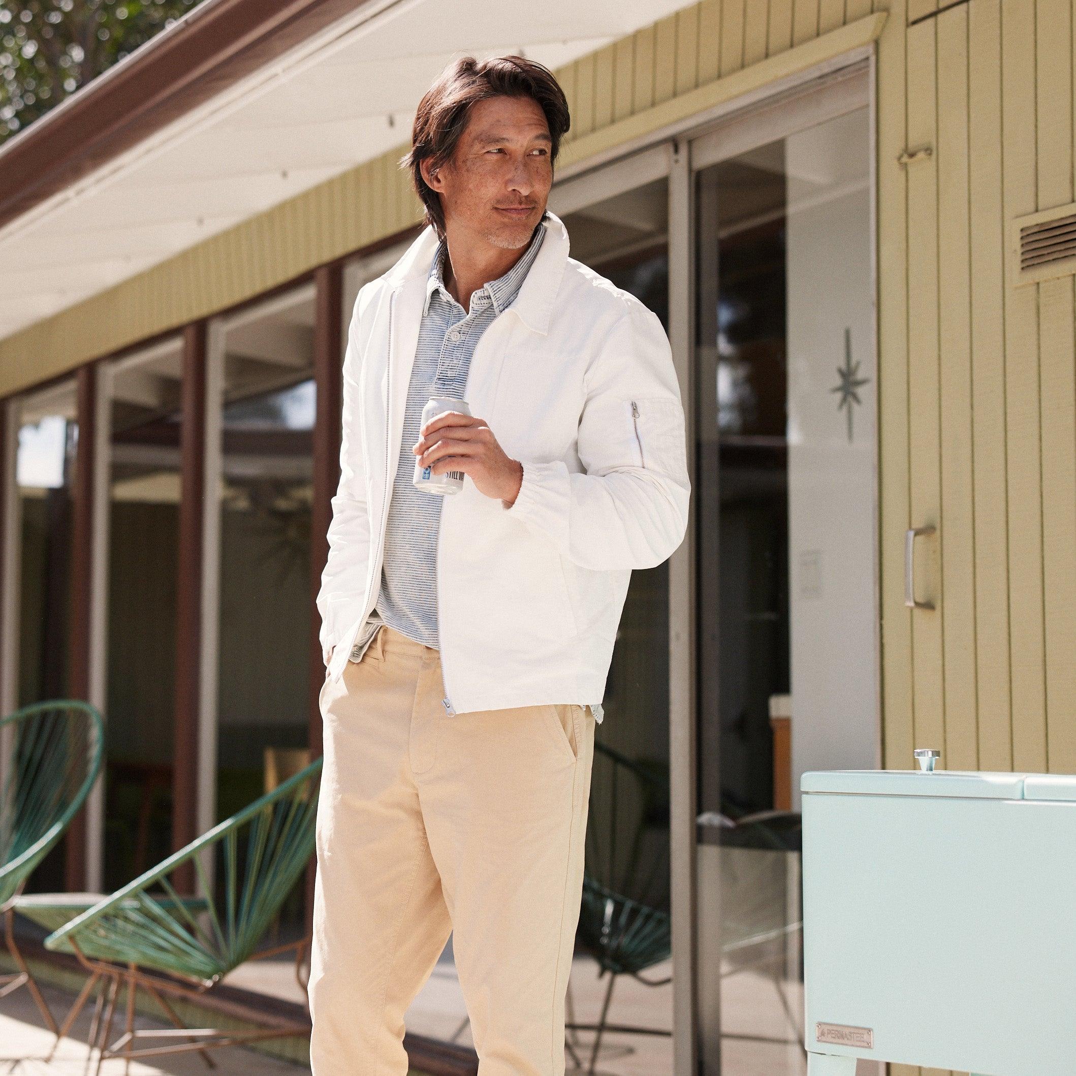 Old school. Back to basics. This livable essential will stave off the chill of the early morning or counter the wind on an evening beach stroll. The perfect antidote for the unpredictable weather of spring, the classic windbreaker is inspired by the iconic all-American zip front light weight jacket. The shell fabric is a compact blend of cotton and nylon, delivering a crisp hand and a fair fight against the wind. The Model is also wearing: Portofino Featherweight Poplin Shirt - Ermine and Alternative Stretch Slim Fit 5 Pocket - Pebble. Model: Adrian is wearing size medium and is 6'. ----Details---- Spread collar 2 welt pockets Left sleeve zip pocket Left chest zip pocket Elasticized cuffs Internal pockets Piped seams Zip front ----Materials---- 68% Cotton 32% Nylon ----Size & Fit---- Measuring Method: All measurements are in inches and based on a flat garment, as shown below. For comparison with one of your existing garments, please lay garment on a flat surface and follow the key measurement points. For chest and neck, if you double the flat measurement, you will get close to the full body measurement. ----Care---- Machine Wash Cold Separately Do Not Soak Before Washing Do Not Bleach Remove Promptly Tumble Dry Low Cool Iron if Necessary