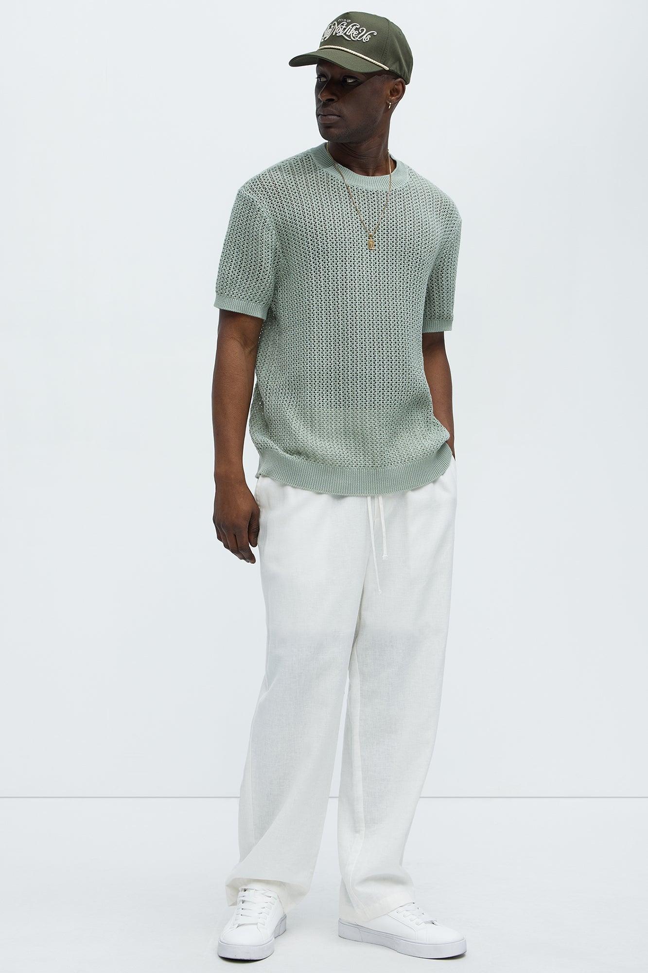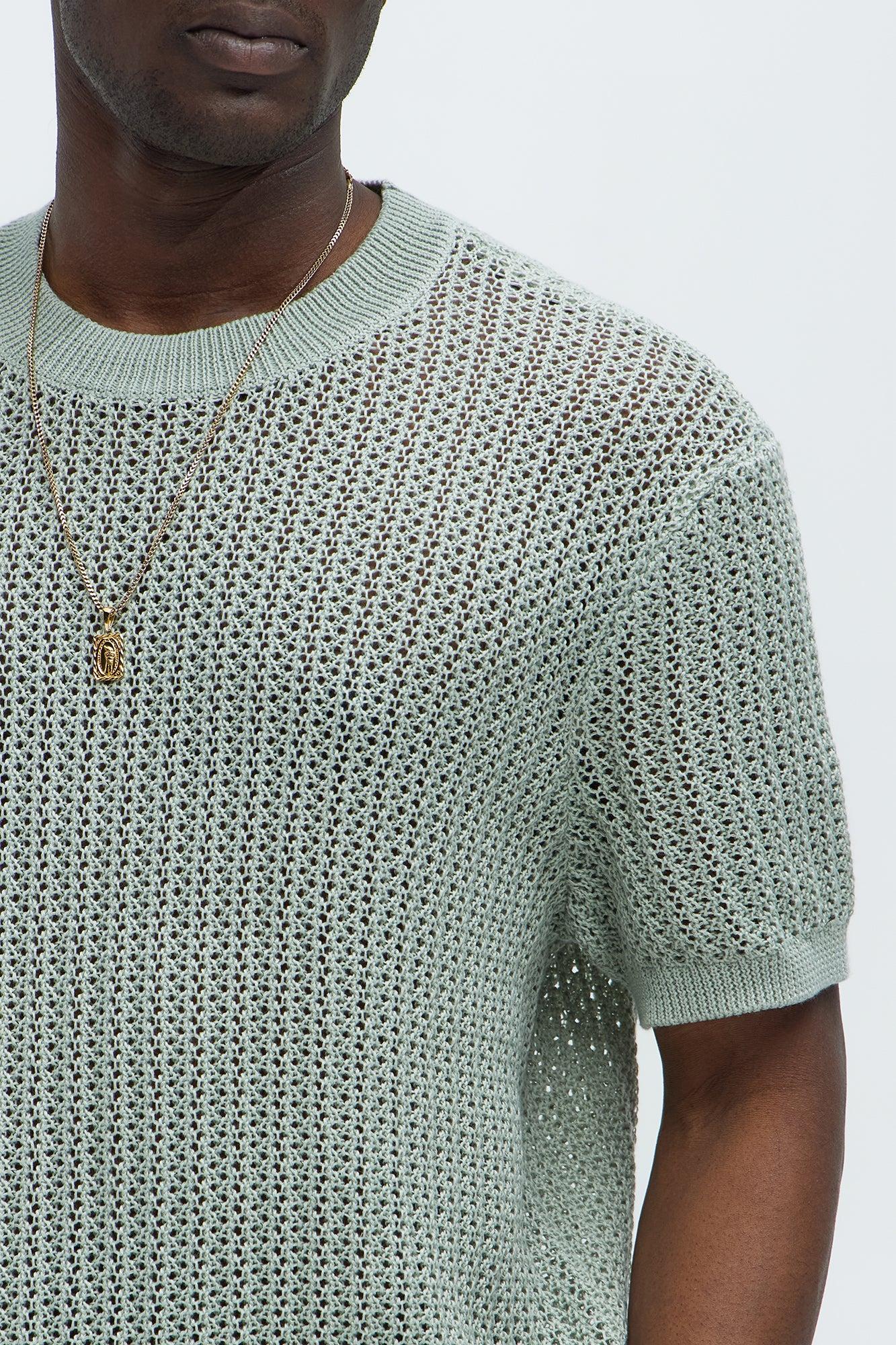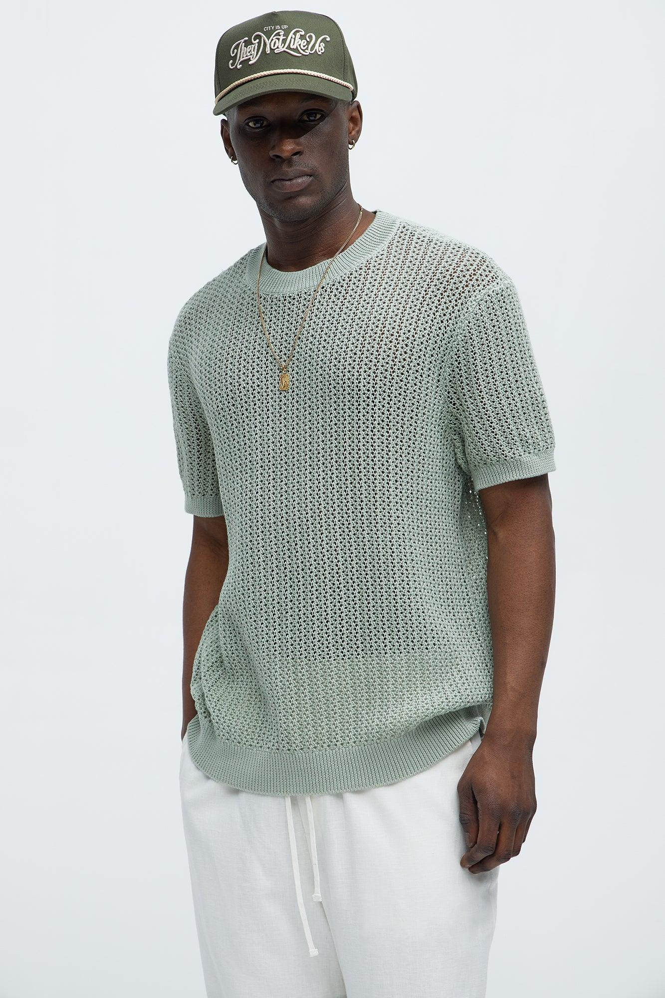Available In Sage. Crew Neck Textured Relaxed Fit Open Knit Short Sleeves 100% Polyester Disclaimer: This garment has been made with delicate materials and may snag or pull if jewelry or watches are worn. Do not wash with items that may cause snagging such as zippers or hooks. This garment is unique and must be handled with care. Imported California Proposition 65WARNING: Cancer and Reproductive Harm - www.P65Warnings.ca.gov.