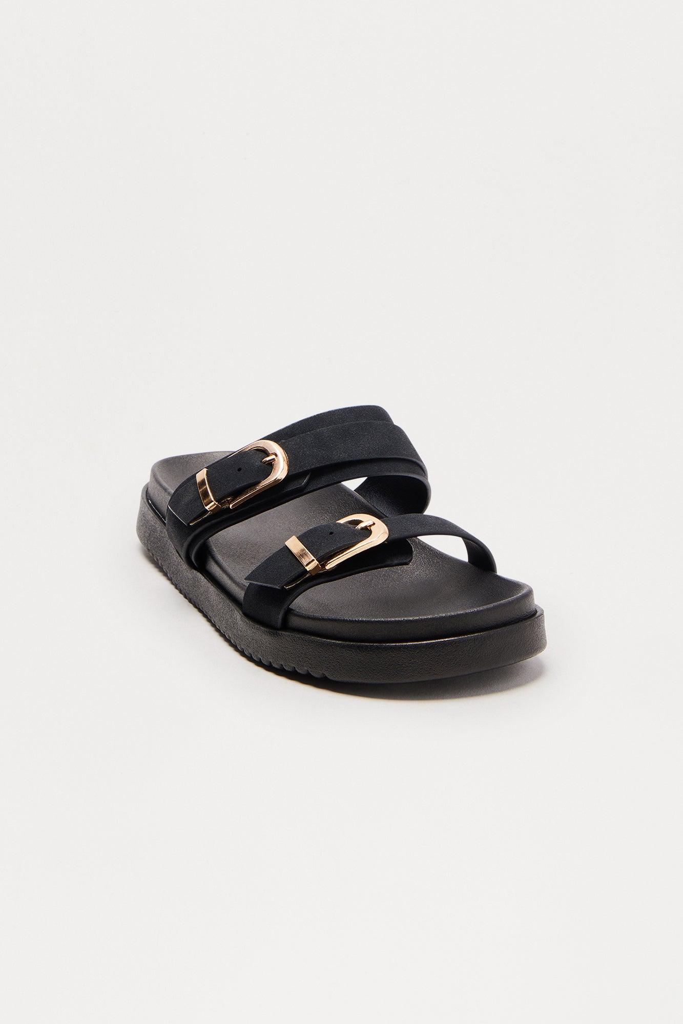 Available In Black, Leopard And White. Casual Slides Slip On Buckle Detail Round Toe Flat Heel Imported California Proposition 65WARNING: Cancer and Reproductive Harm - www.P65Warnings.ca.gov.