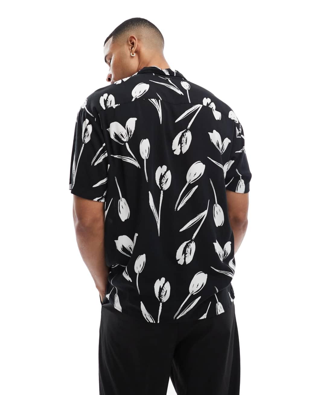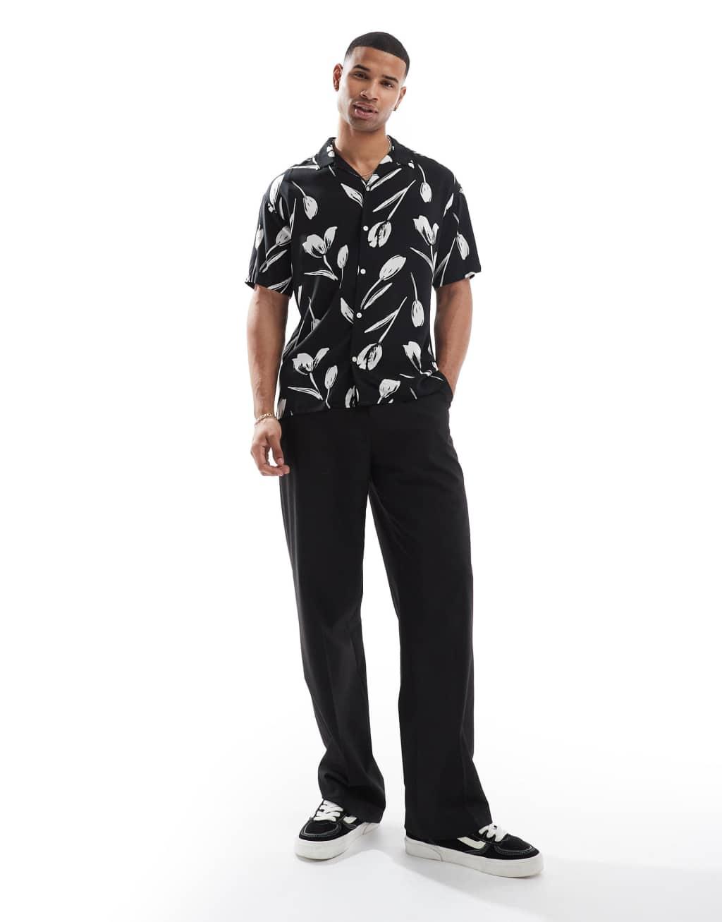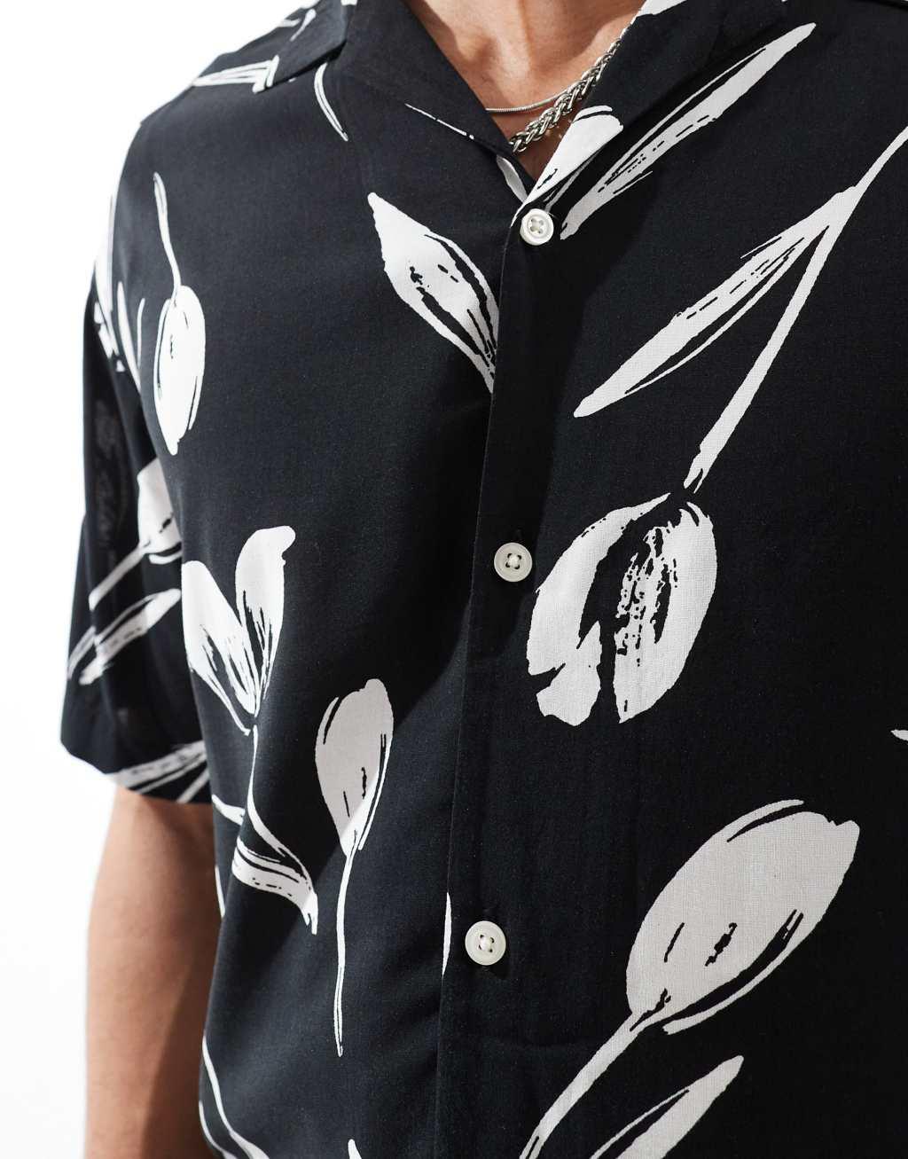 Jack & Jones revere collar floral print shirt sleeve shirt in black