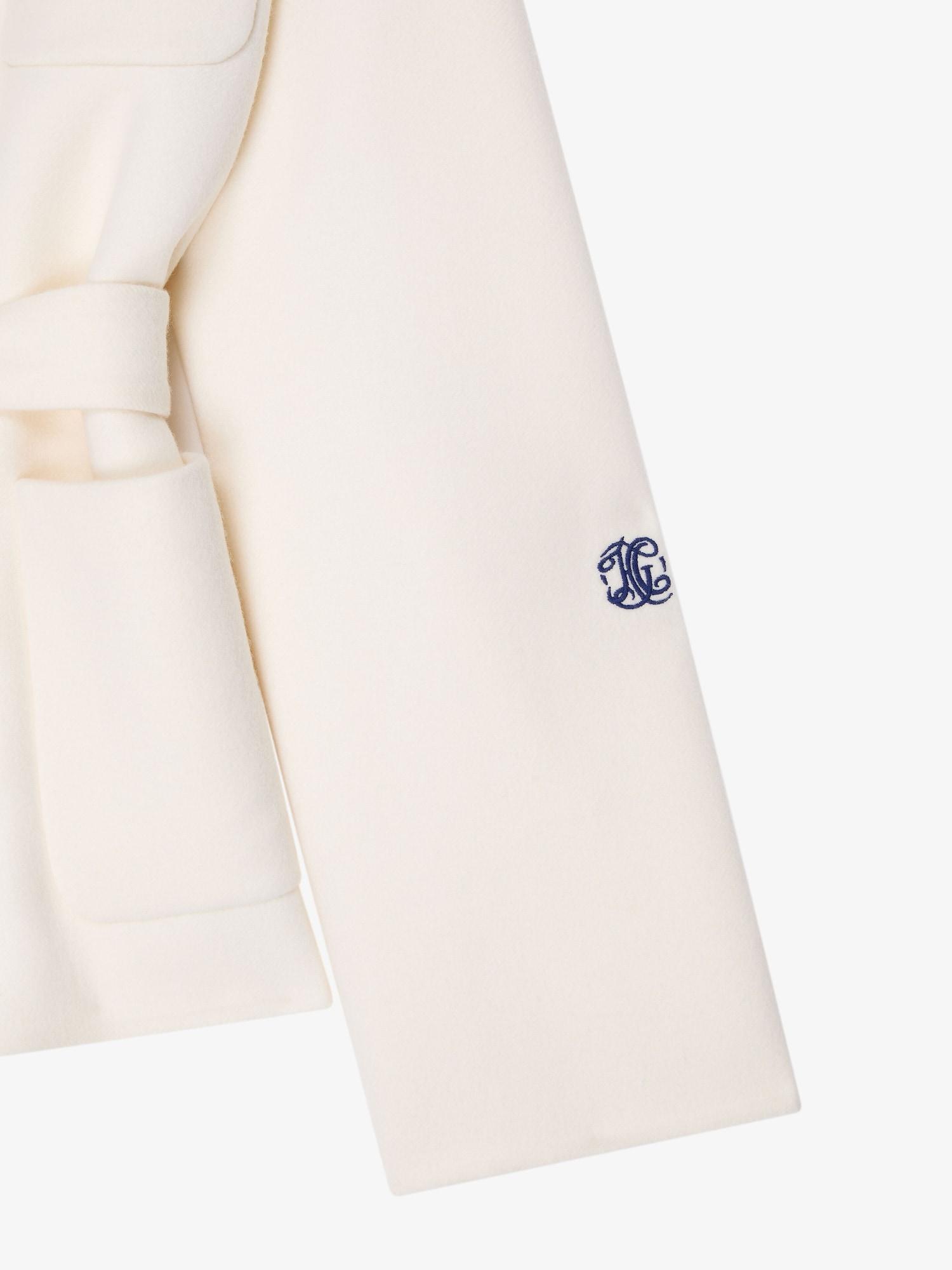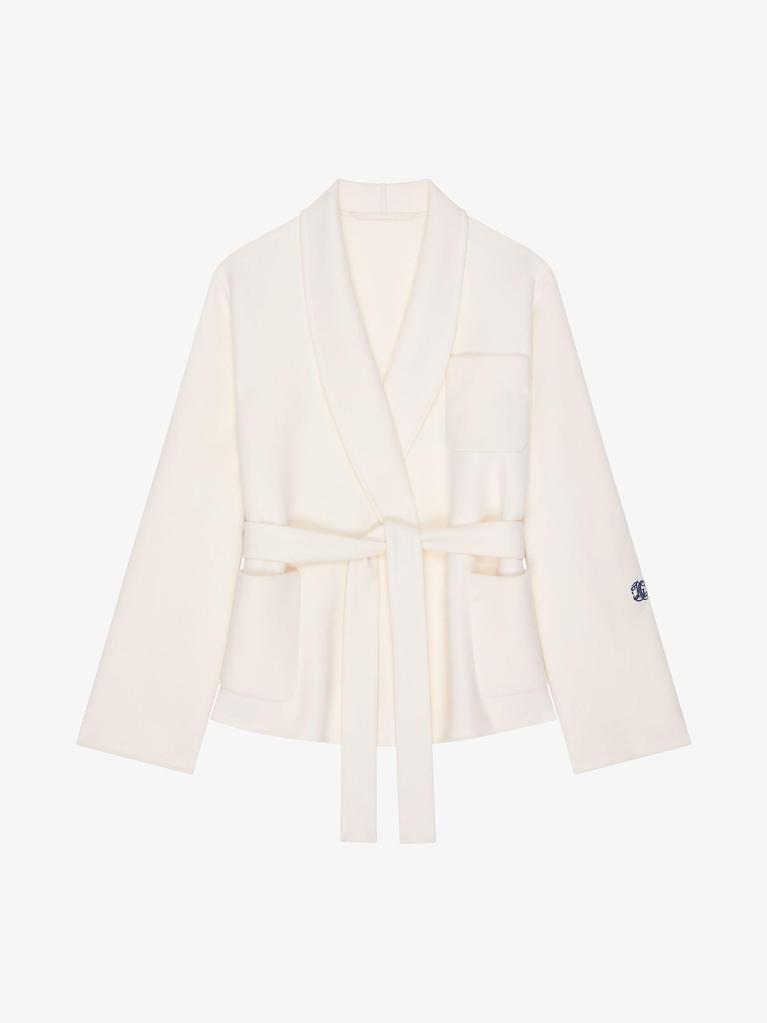 The initials of Hubert de Givenchy, originally used on the furniture of his countryside home, are reimagined in refined embroidery. Dressing gown inspired jacket in wool. Shawl lapel. Contrasting HG initials embroidered on the left sleeve. Removable and adjustable waistband. One chest pocket. Two front pockets. Model measures 6.1 Feet and wears a size 48.