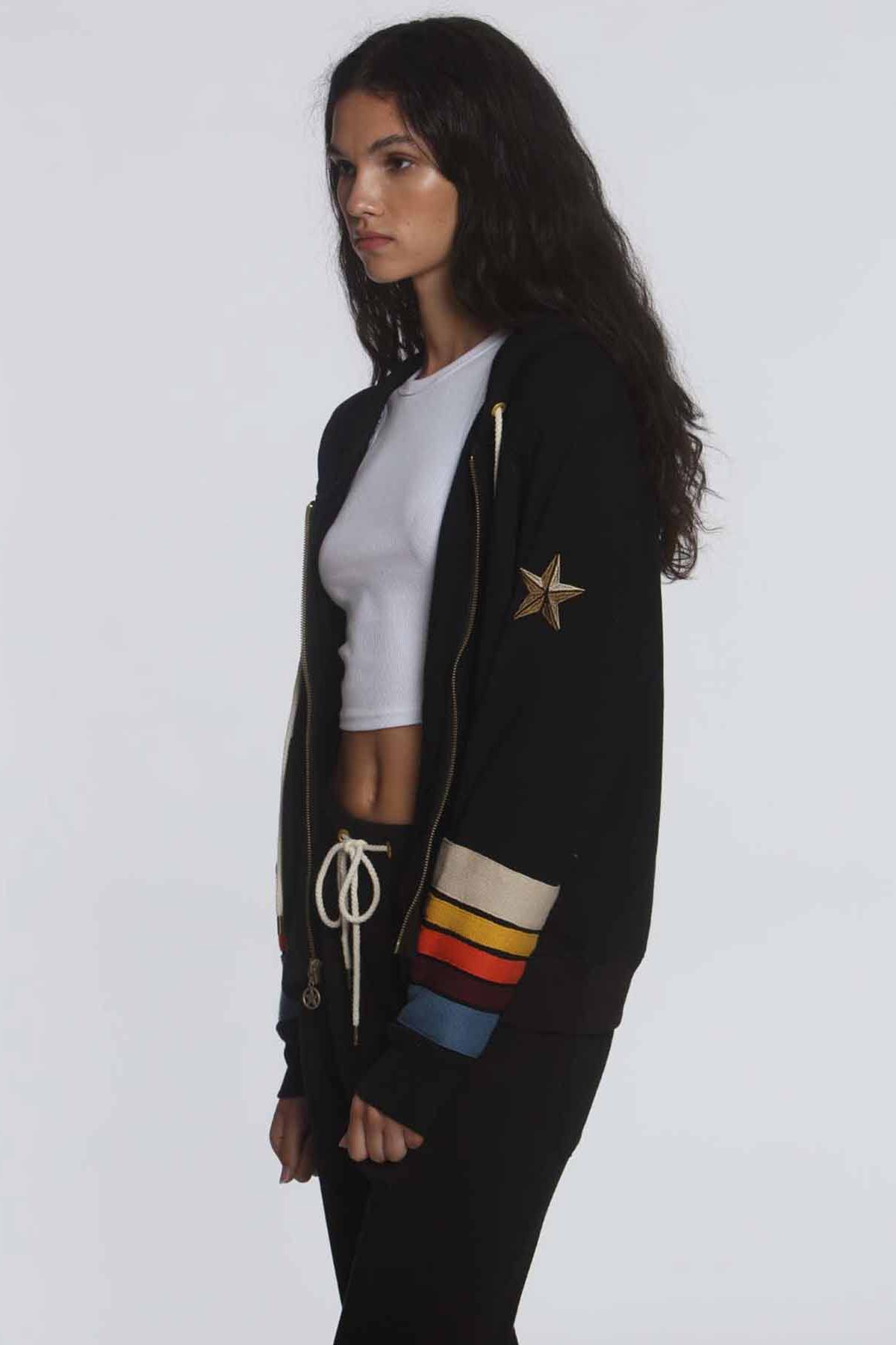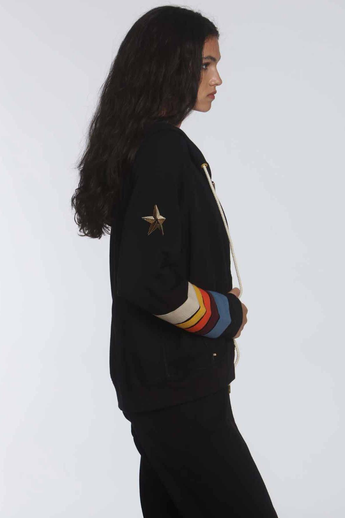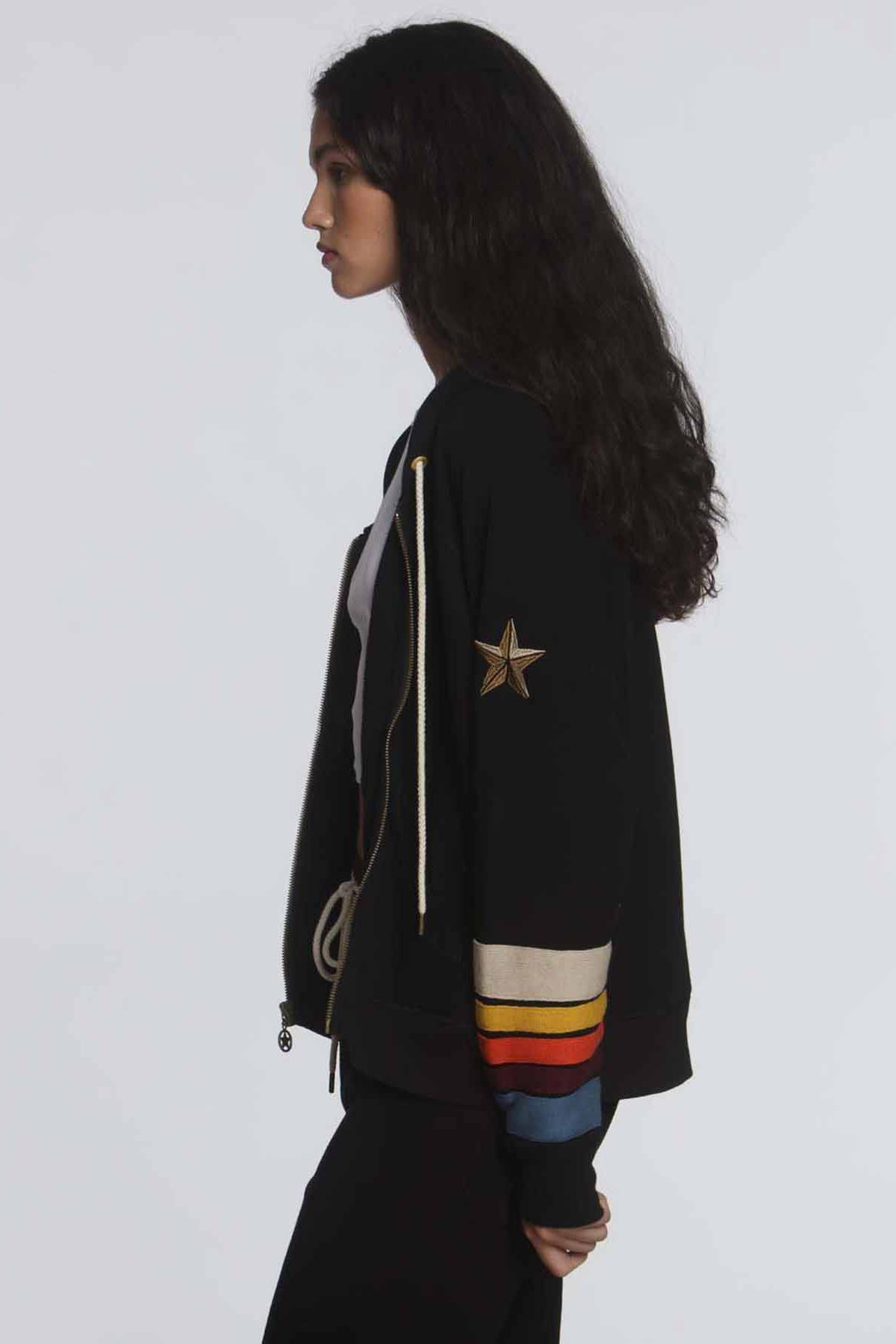 The Jackie Sweatshirt is an easy fitting zip hoodie with all the vintage vibe you could possibly want. Made from our loop back French terry with subtly twisting seams, pre-washed for a relaxed and lived-in feeling. Coverstitched and embellished with individually appliqued bands of knitted strips. Metallic smooth closing zipper, and a star themed metallic pull. Corded cotton drawstrings with metal logo tips, matte metal grommets and a satin stitch embroidered star on the bicep. We think quality is in the details and we know you do too! Match it back to the Summit Sweatpant or wear on its own with denim.