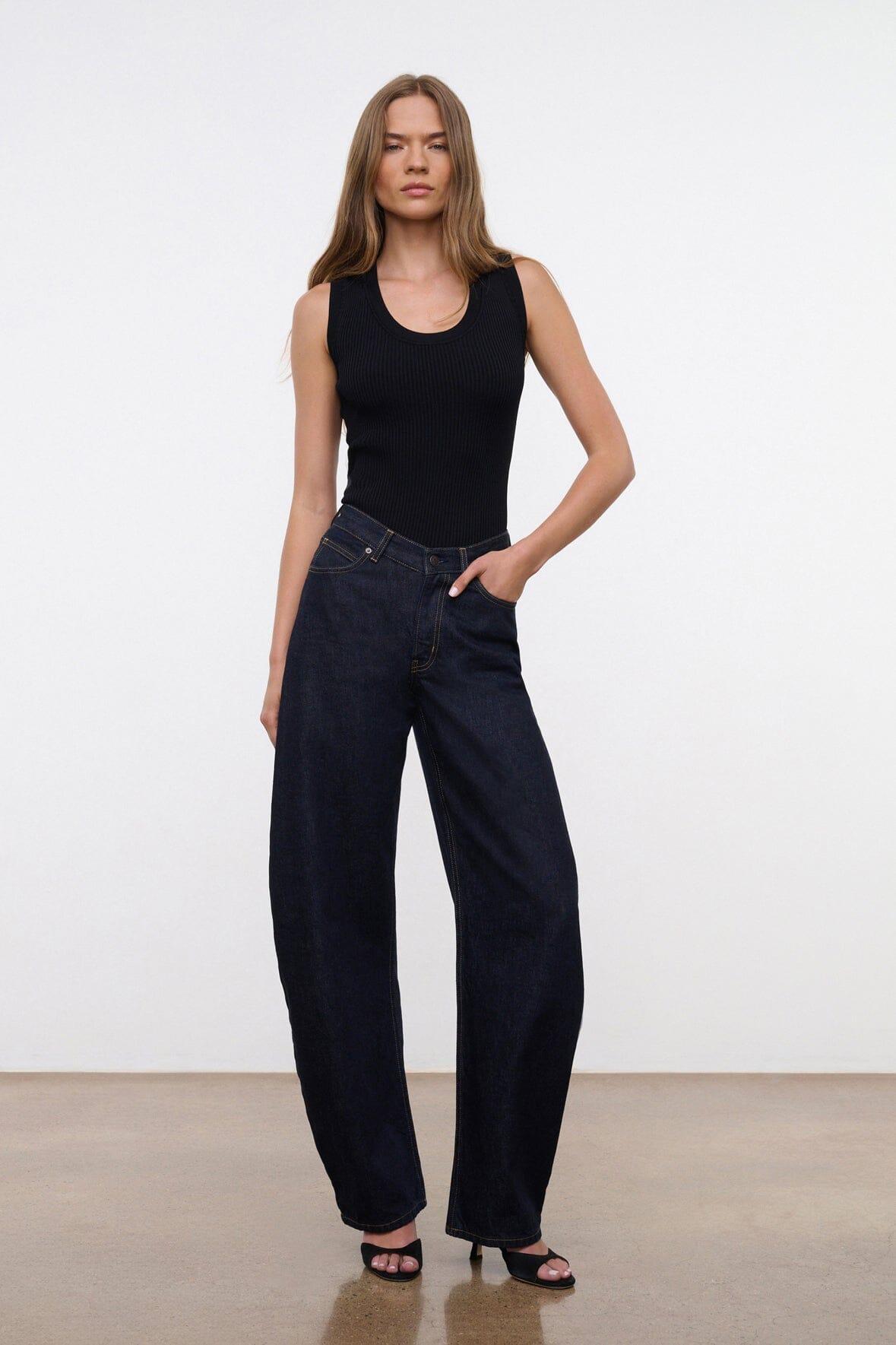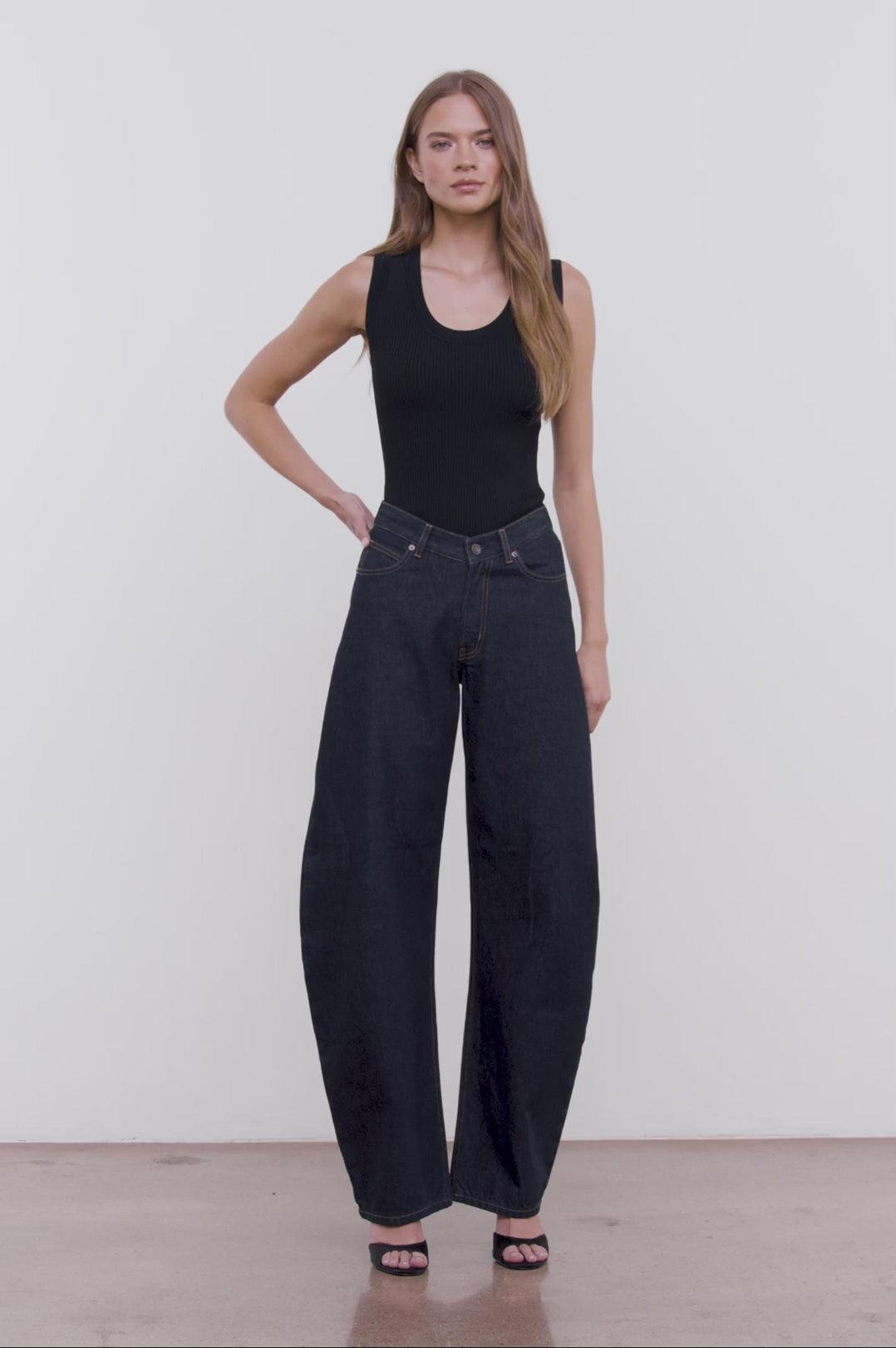 The Jackson Jean is a dramatic barrel-leg silhouette with a flattering V-waist that sits high on the hip. Cut from Italian rigid denim with antique-finish hardware, it’s detailed with a cinching V-shaped yoke at the back and logo-embroidered zip fly.