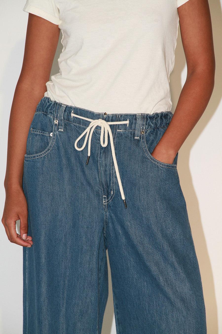 Jackson has an elasticated waist with zip-fly and drawcord that sits relaxed through the hips and thigh but can be tightened as desired. It’s loose, barrel leg and deep scoop pockets create a modern workwear look.