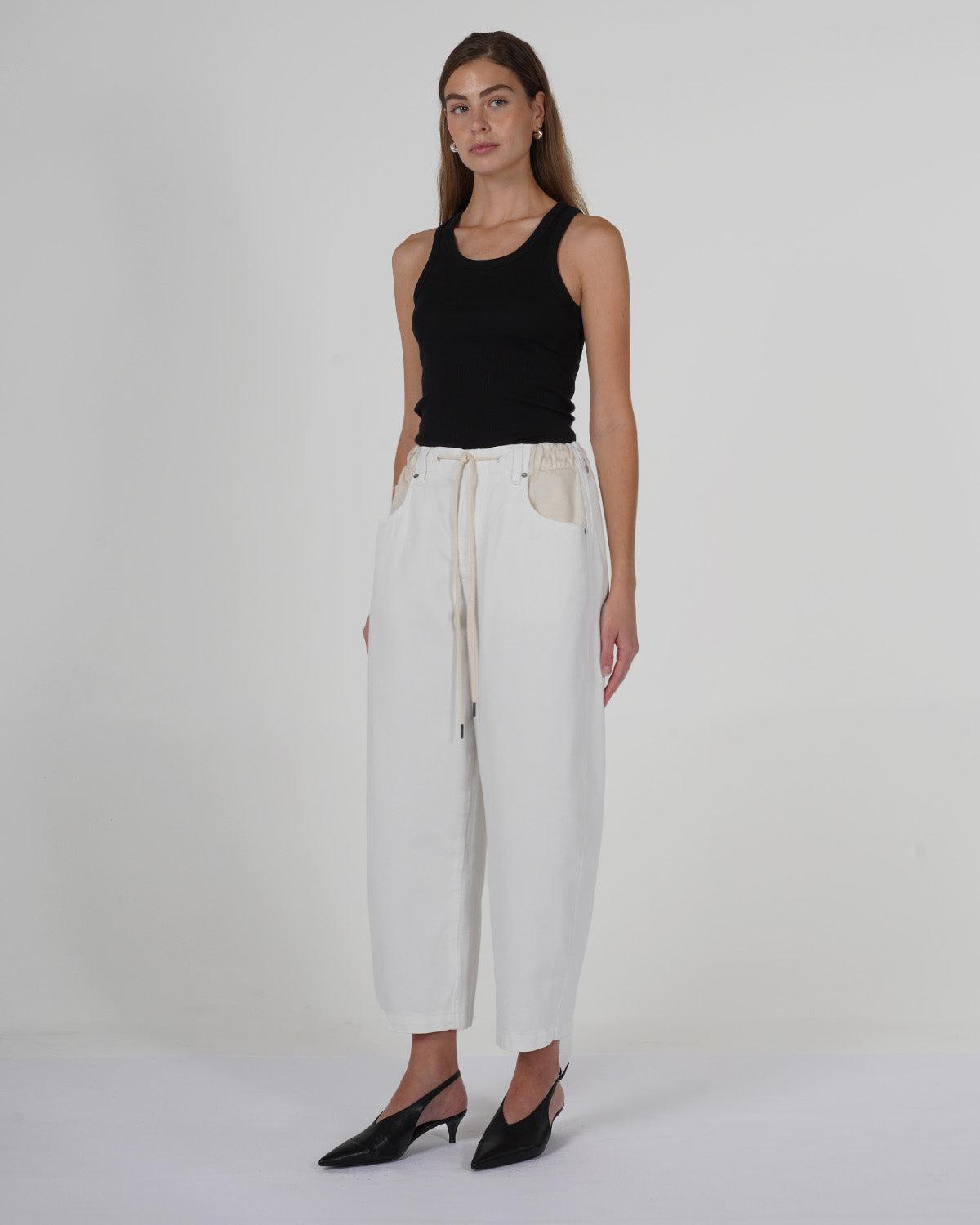 Jackson has an elasticated waist with zip-fly and drawcord that sits relaxed through the hips and thigh but can be tightened as desired. It’s loose, barrel leg and deep scoop pockets create a modern workwear look.