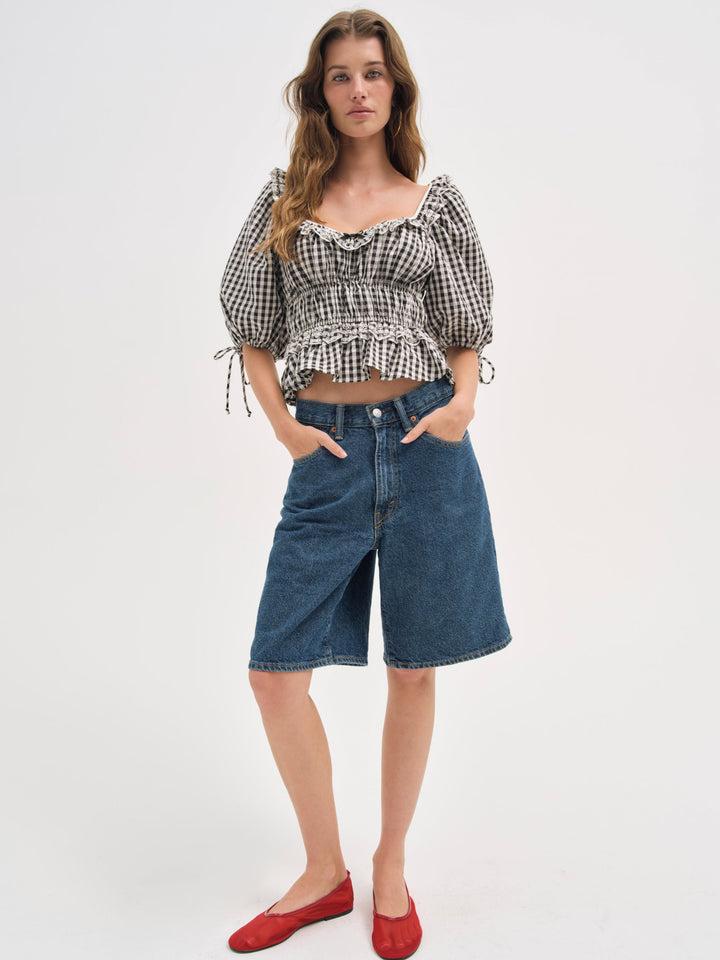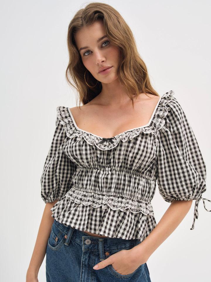 Embrace the breezy charm of coastal America with the Jackson gingham crop top–a vintage-inspired peplum blouse featuring a shirred bodice, puff sleeves, and delicate ruffled eyelet trim throughout.