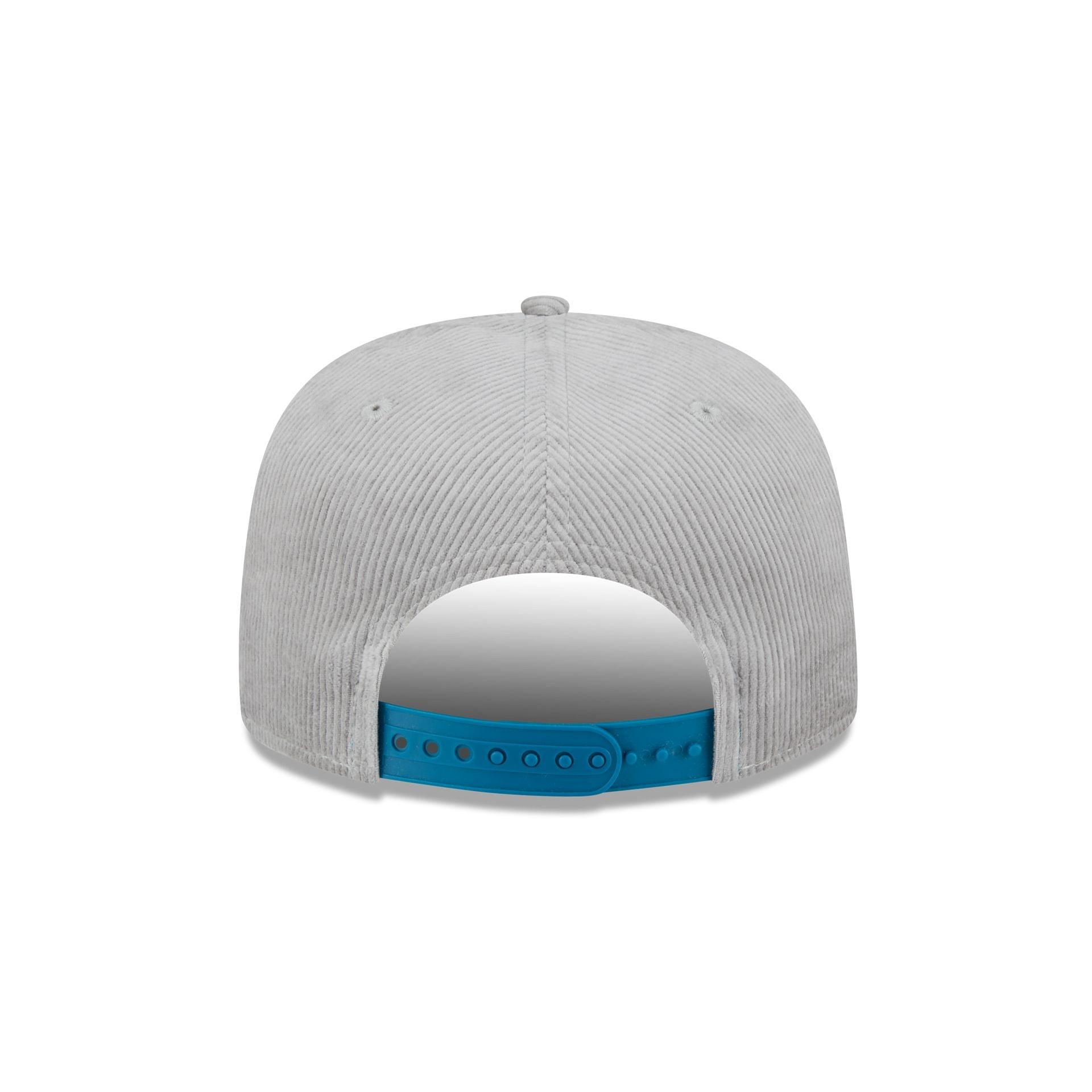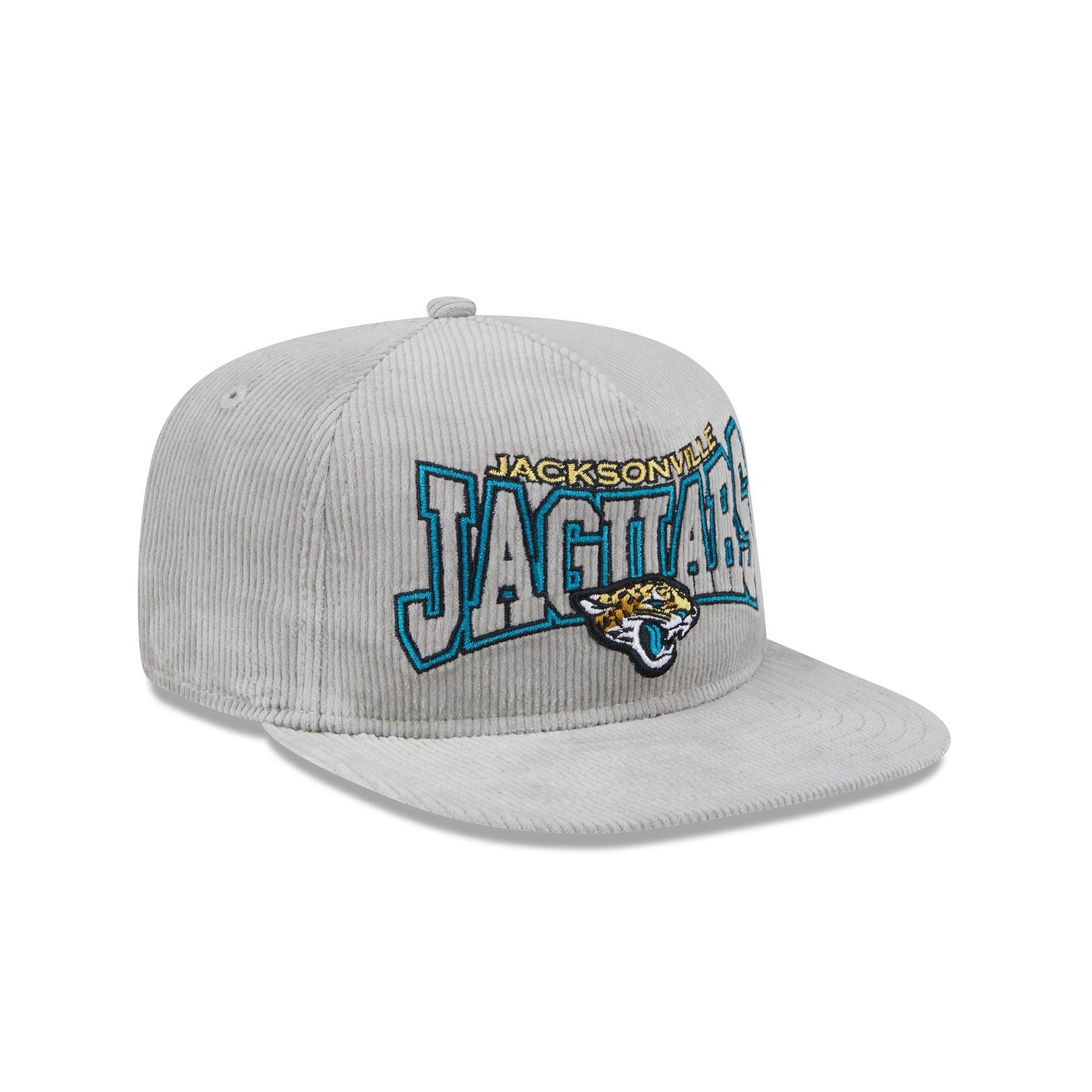 The Jacksonville Jaguars Gray Cord Golfer features an embroidered Jaguars wordmark and logo at the front panels against a gray corduroy fabrication throughout. Additional details include a matching snapback closure at the rear and a gray undervisor.