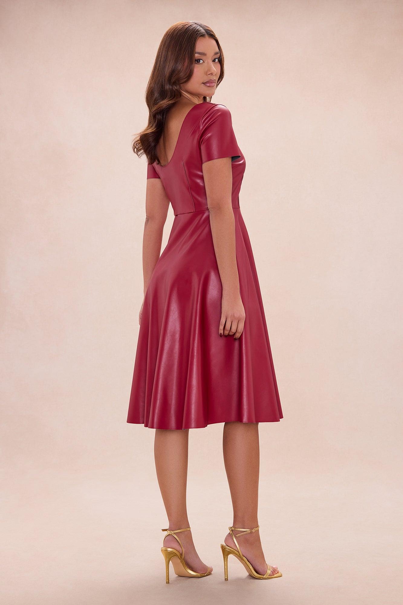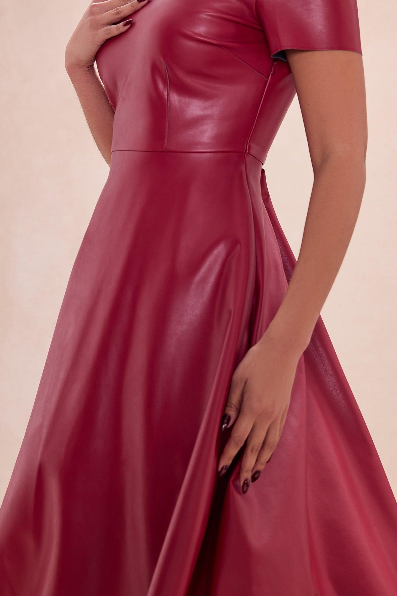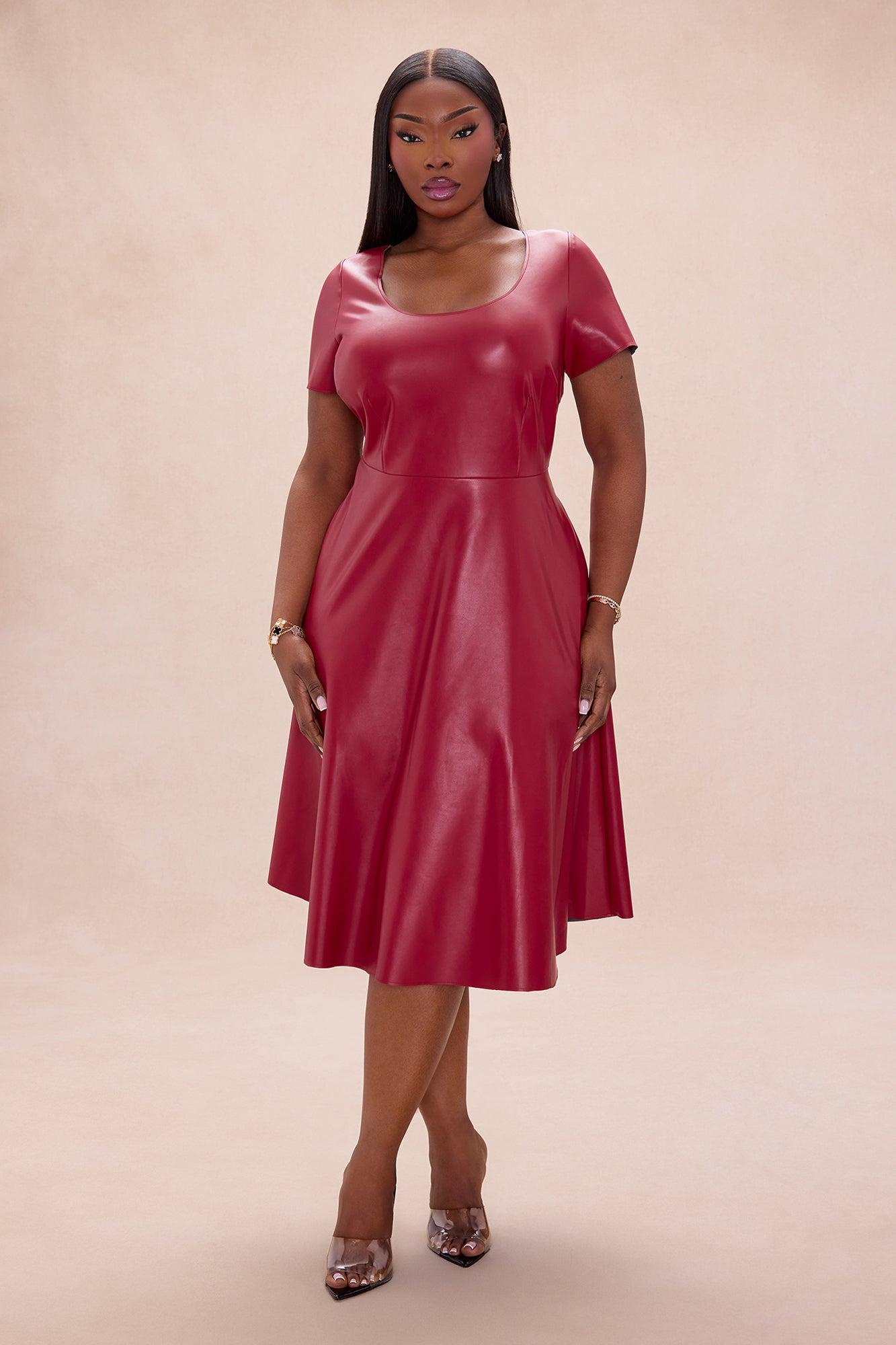 Available In Black, Burgundy And Camel. Faux Leather Midi Dress Cap Sleeves Scoop Neckline Hidden Side Zipper Closure Stretch Shell: 100% Polyurethane Lining: 100% Polyester Imported California Proposition 65WARNING: Cancer and Reproductive Harm - www.P65Warnings.ca.gov.