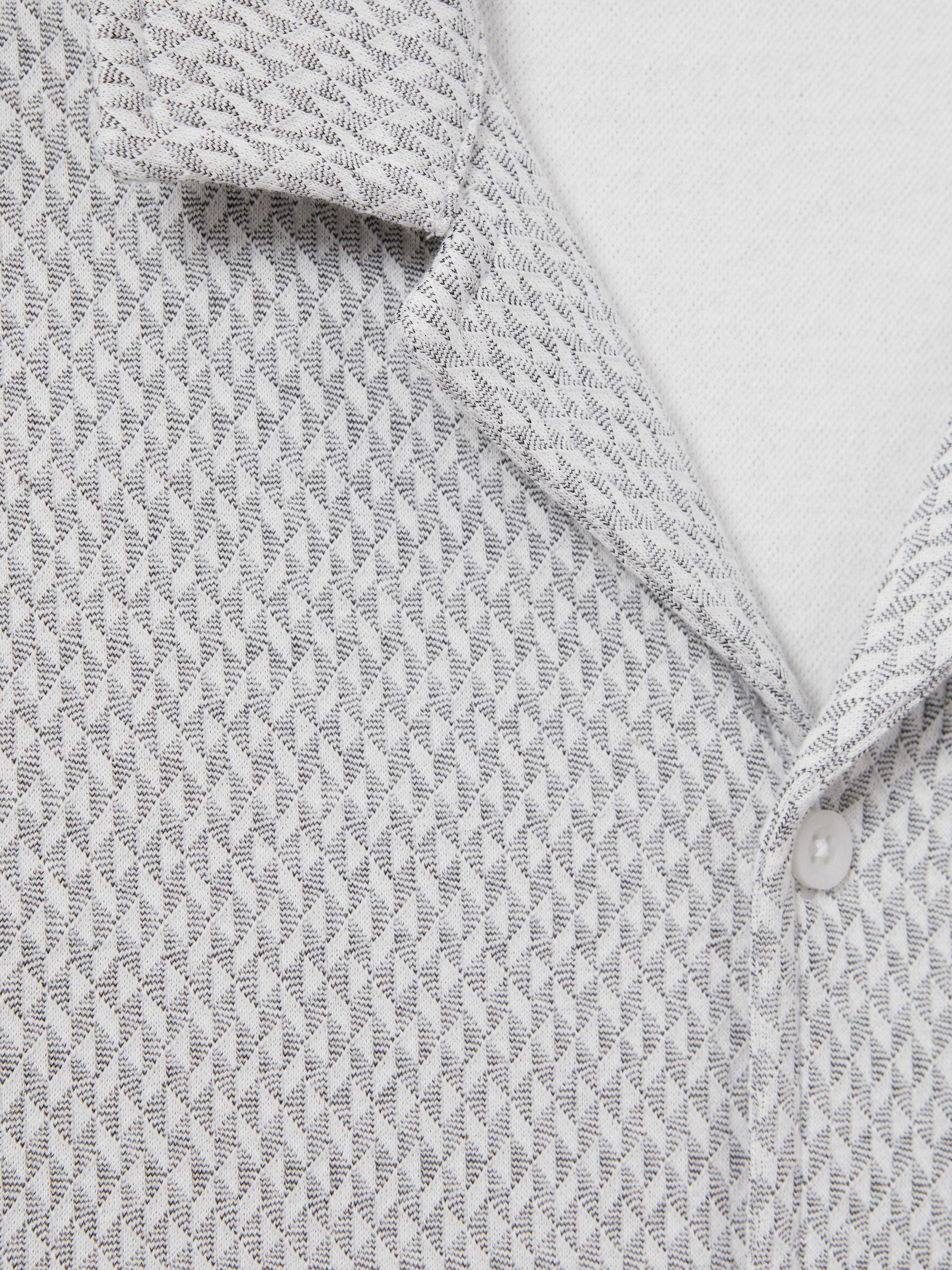 The Brewer shirt is woven from cotton into a jacquard design for a soft, subtle texture. It's Cuban collar front fastens with buttons. Cotton blend. Jacquard design. Cuban collar. Button-front closure. Split hem. The model is wearing a size M. Measurements of model: Height 6ft 2.5 / 189cm.