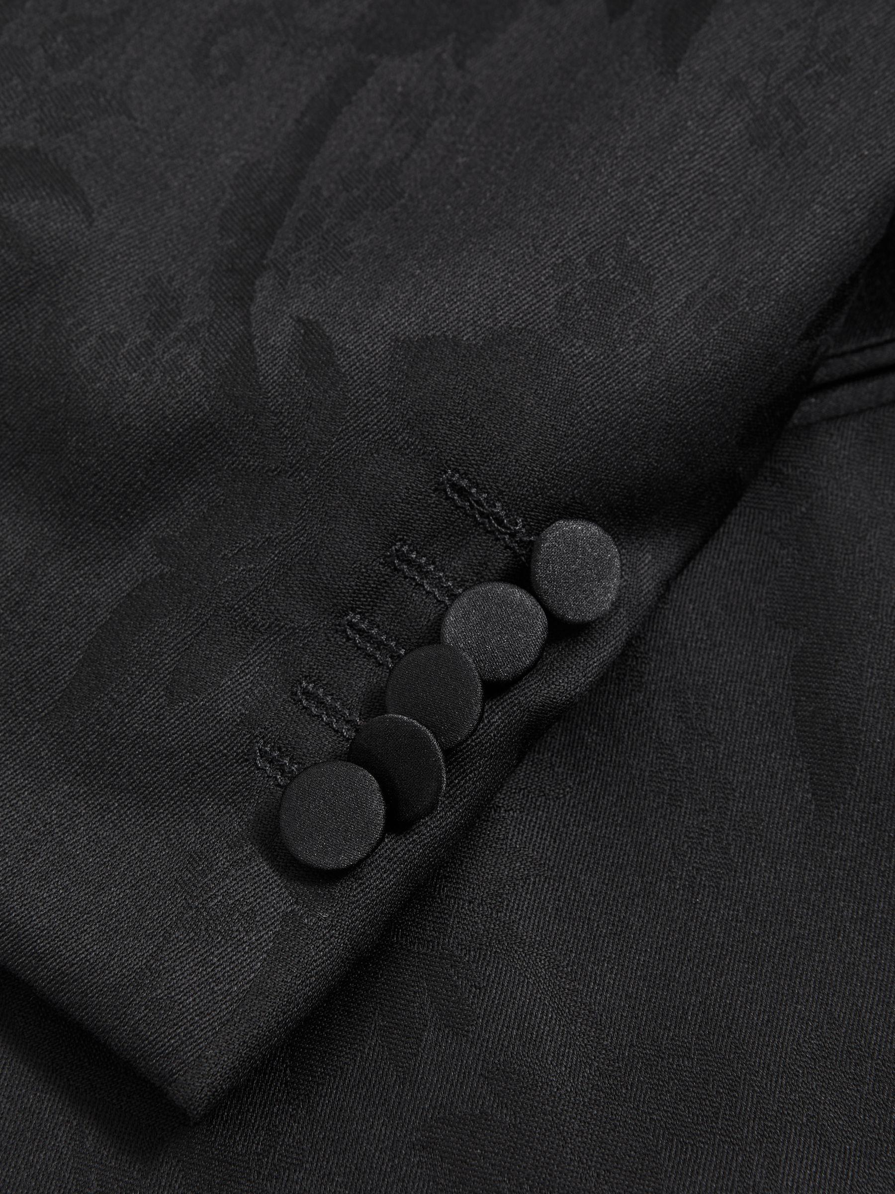 Oscar Jacobson, curated by Reiss, is an established range of men’s formalwear designed in Sweden and sewn in Europe, to be enjoyed for all of life’s occasions. Understated yet undeniably stylish, the black Eray blazer is cut from a high-shine wool fabrication and fitted with satin peak lapels, allowing a supreme sheen beneath the lights. It's double-breasted front secures with a single button at the front, modernising a classic silhouette. Complete your black-tie edit with a pair of the brand’s tailored trousers and a formal bowtie. Wool blend. Double breasted. Satin peak lapels. Single button fastening. Jetted pockets. Long sleeves. Buttoned cuffs. Internal pockets. Dual vents to reverse. Lined. The model is wearing a size 38 Measurements of model: 6ft 2" / 188cm.