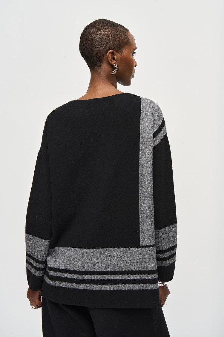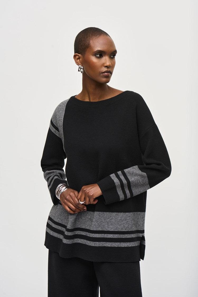 Showcase your confident style in this jacquard sweater knit top featuring a boat neck and eye-catching placement stripes.