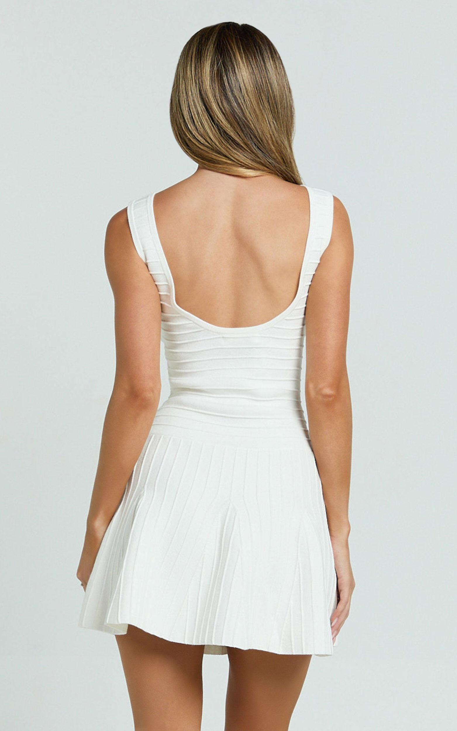 Featuring a flattering high neckline and playful fit-and-flare shape, it hugs your curves perfectly while the delicate pleats add dreamy, graceful movement. In a timeless cream shade, this standout mini is ready to elevate your look, from brunch with friends to nights on the town.Pair it with gladiator sandals for a flirty daytime vibe, or keep it casual with your favorite white sneakers for relaxed weekend adventures. Whether you're shopping for that perfect homecoming dress or simply refreshing your wardrobe staples, the Jacqueline Mini Dress is ready to shine at the center of every style story you create.Product Details:Zips closureKnit DressFully Fashioned KnitHigh necklineParty perfectMini lengthSleeveless designRecycled PolyesterMaterial and CareMain Fabric: 65% Recycled Polyester, 35% CottonHigh StretchConcious ProductThe main fabric of this product is made from at least 50% Recycled Polyester, Recycled polyester reduces waste in the supply chain & has a lower impact than raw polyester