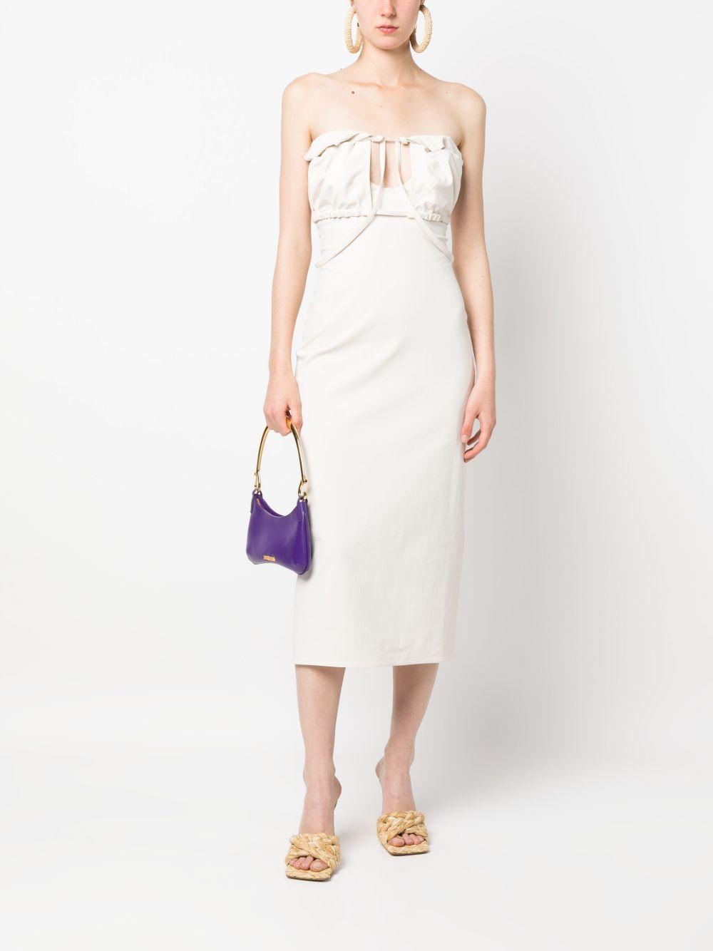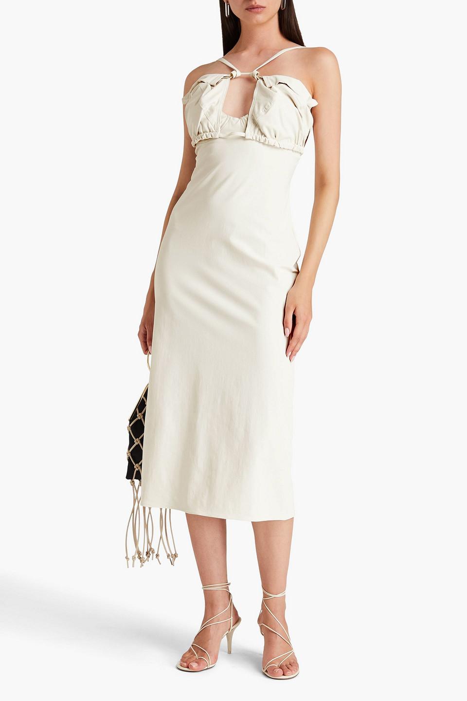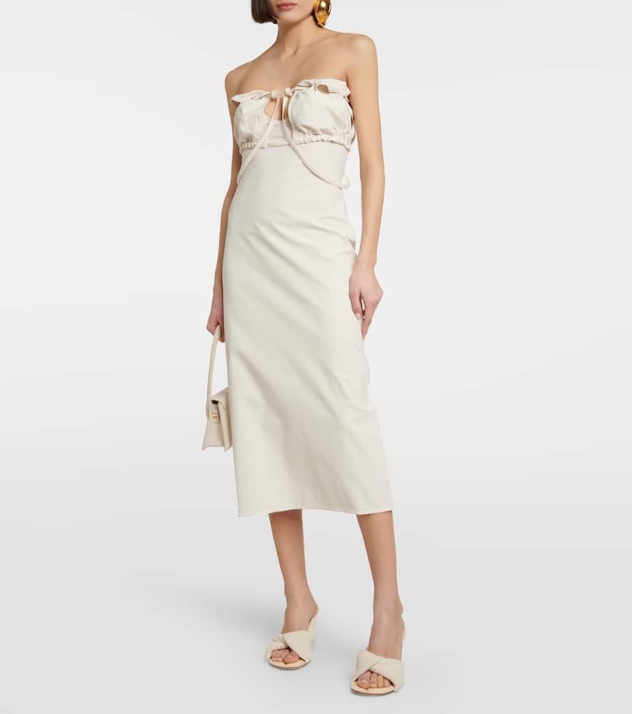 Shop Jacquemus Strapless Ruffled Cutout Twill Midi Dress In White from 800+ stores, starting at $230. Jacquemus La Robe Bikini deconstructed strapless dress in ivory stretch twill polyamide/cotton blend with open neckline, hanging straps, open keyhole bandeau bust, elasticated straps with metal lobster-claw closure, back slit, concealed zip closure, fitted shape, mid-calf length and self-fabric straps that wrap around the waist and tie in the back.