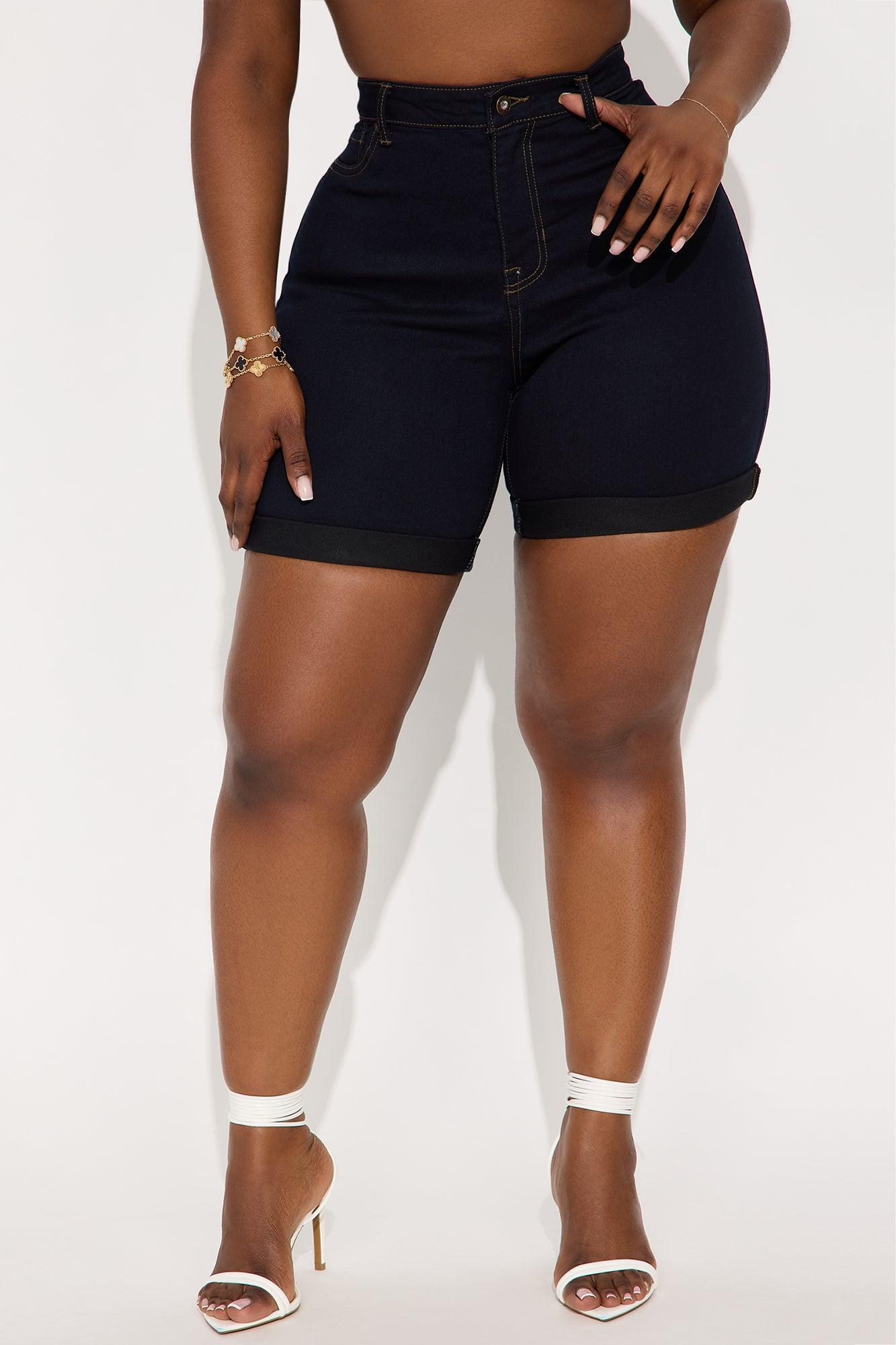 Available In Dark Wash. Bermuda Short Faux Front Pockets Functional Back Pockets Studs Detail Rhinestone Button Roll Cuff High Stretch 12" High Rise 6.5" Inseam Cuffed 9" Inseam Uncuffed Disclaimer: Due To The Specialized Wash, Each Garment Is Unique. 65% Cotton 20% Polyester 14% Rayon 1% Spandex Imported