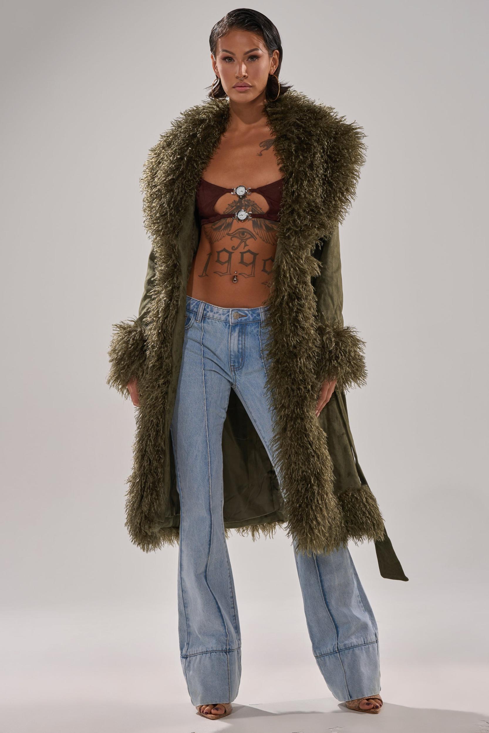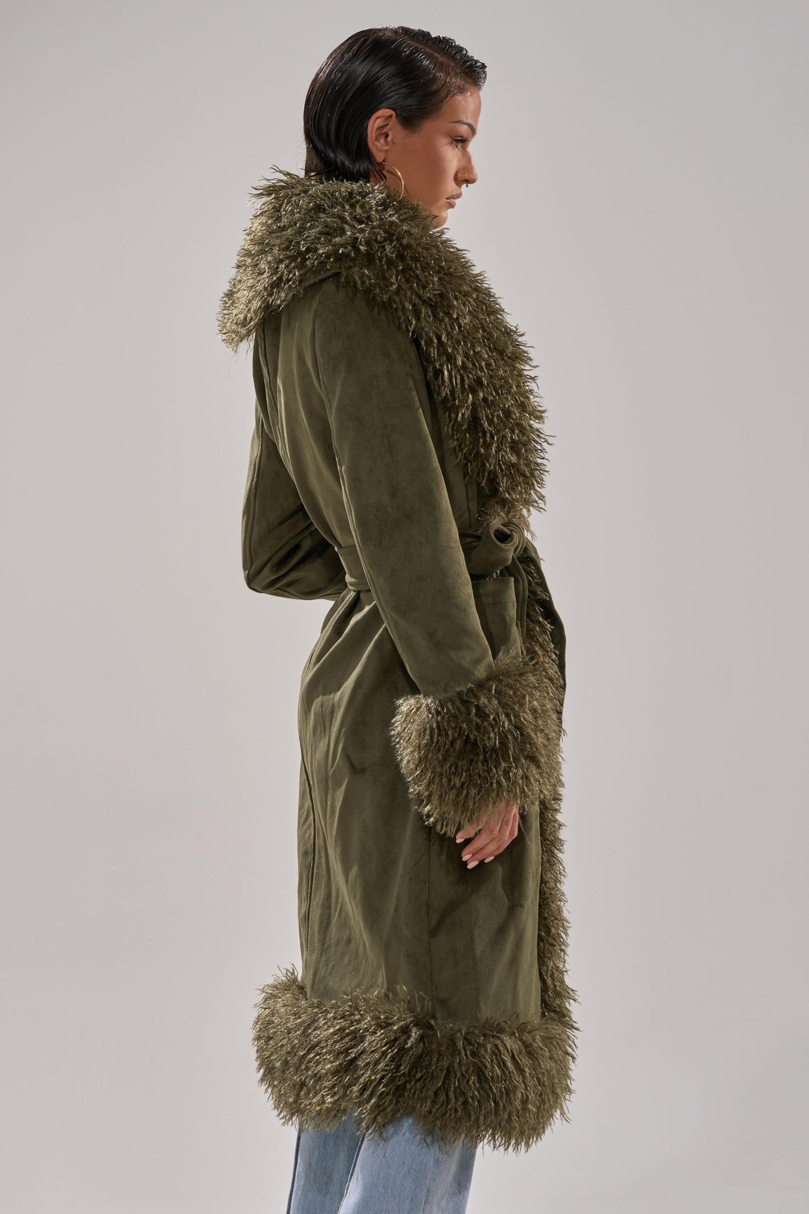The AKIRA Label Jade Fur Trim Trench is crafted from supple faux suede with tonal, shaggy faux fur trim hemlines. It features a plush fur collar, long sleeves with coordinating fur cuffs, waist pockets, a coordinating self-tie waist belt, concealed hook-and-eye front closures, and a silky inner lining. Complete with a fabulous longline silhouette. - Fabric: 92% Polyester 8% Spandex, Fur: 100% Polyester, Lining: 100% Polyester- No Stretch- Imported (all measurements approximate from small) - 40” Shoulder to Hem- 15” Shoulder to Shoulder- 23” SleevesProduct ID: 1059677 (all measurements approximate from 1X)- 44” Shoulder to Hem- 17” Shoulder to Shoulder- 25” SleevesProduct ID: 1059681
