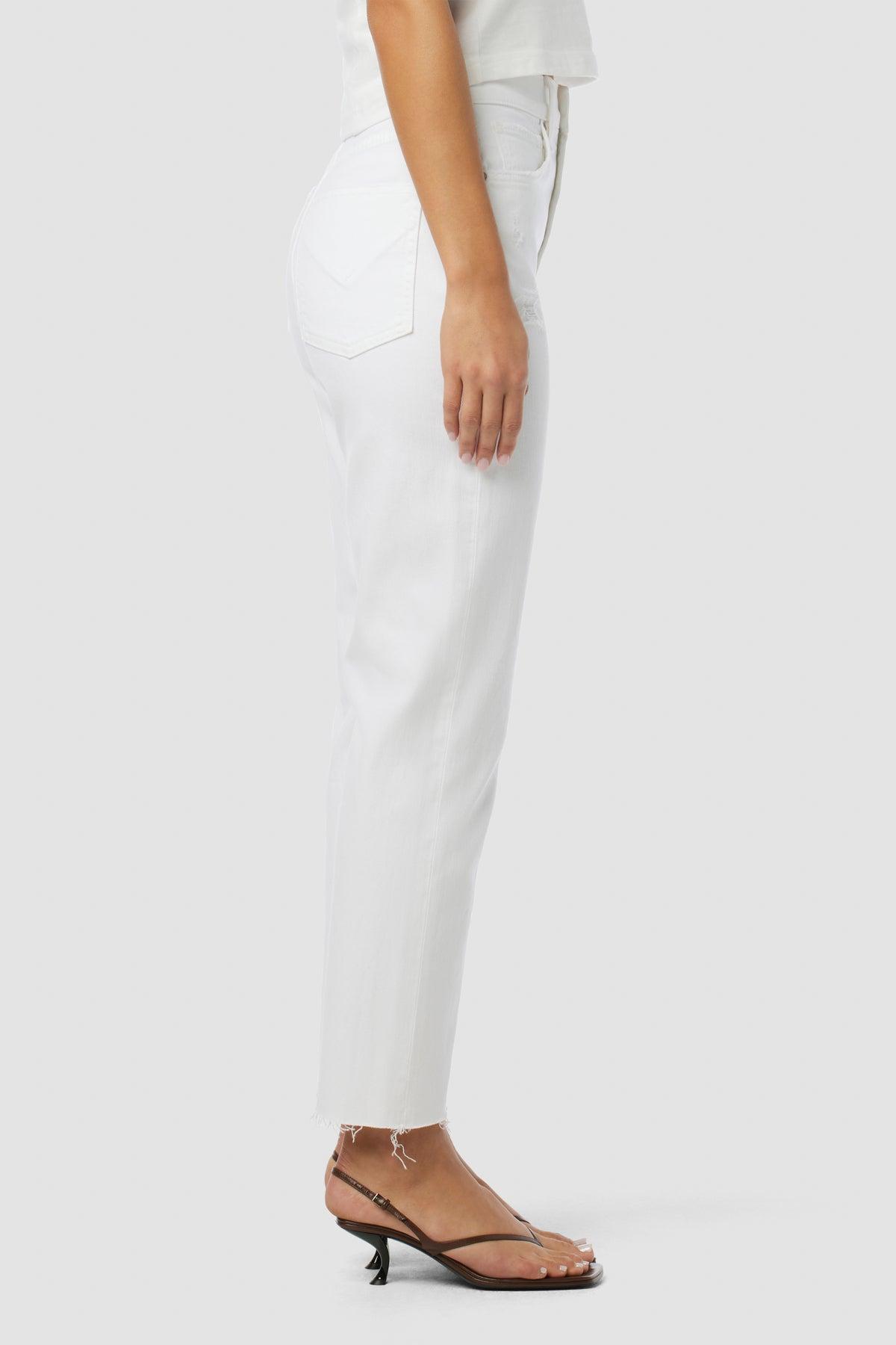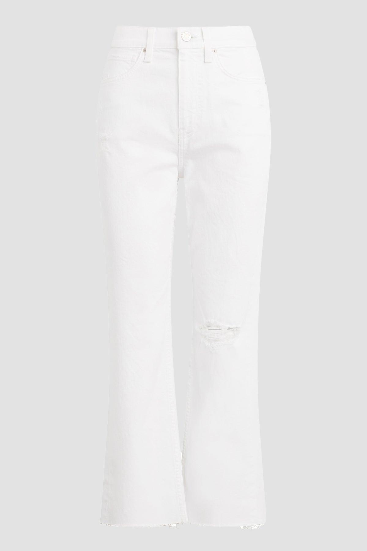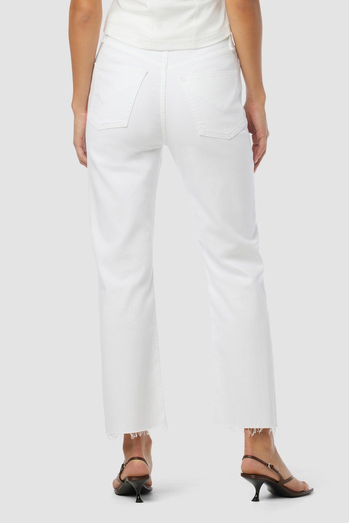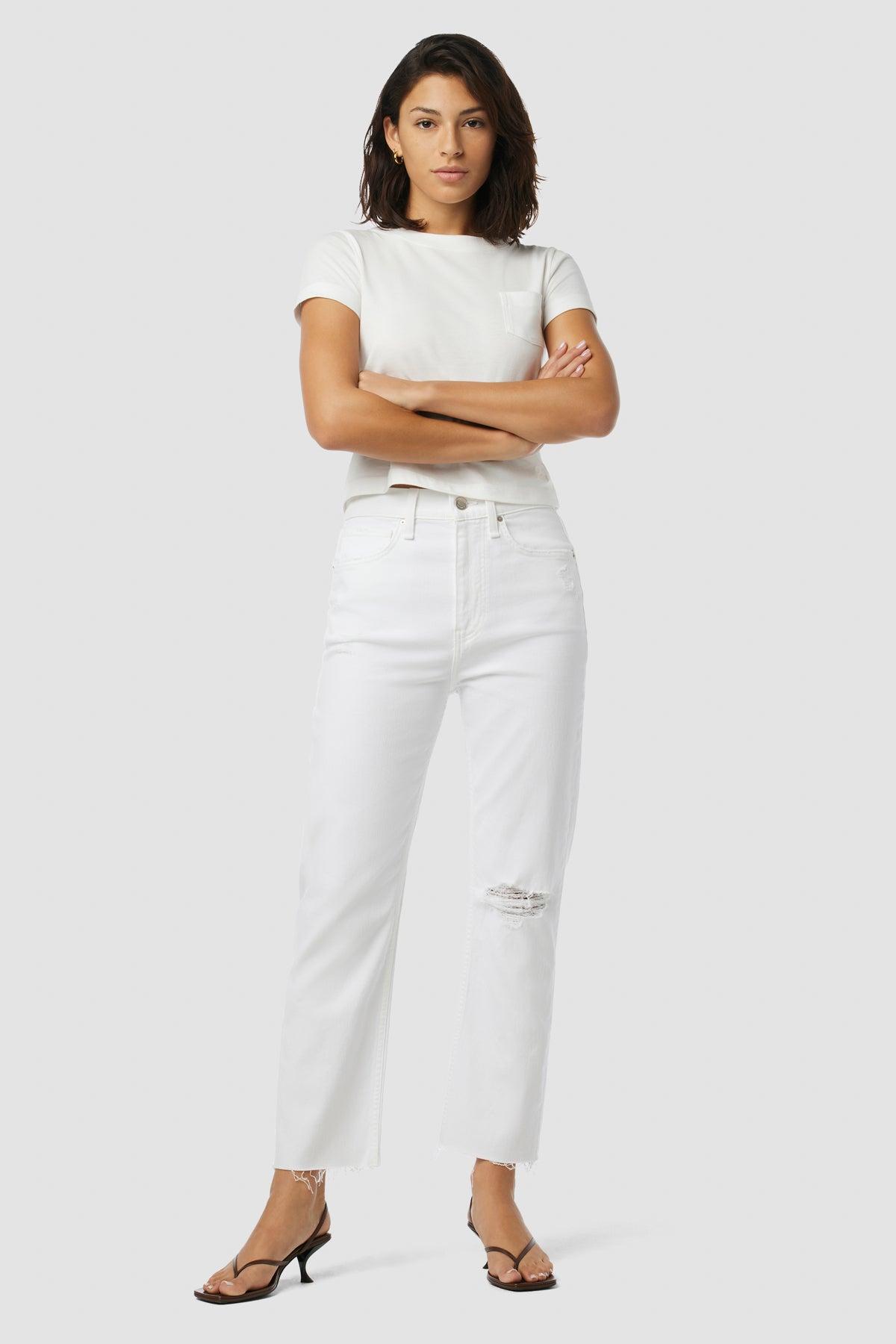Description Our Jade High-Rise Straight Crop Jean in Torn White is cut with a loose, ’90s-inspired fit from Refined Vintage comfort stretch denim with expert destruction and raw hems. Product Details Front Rise: 12.5", Leg Opening: 16", Inseam: 27"Model Height 5'9"Model wearing size 25Measurements based on size 27 Fit & Care Content: 63% Cotton, 35% Lyocell, 2% ElastaneMachine wash cold with like colorsDo not bleachTumble dry low or hang to dry