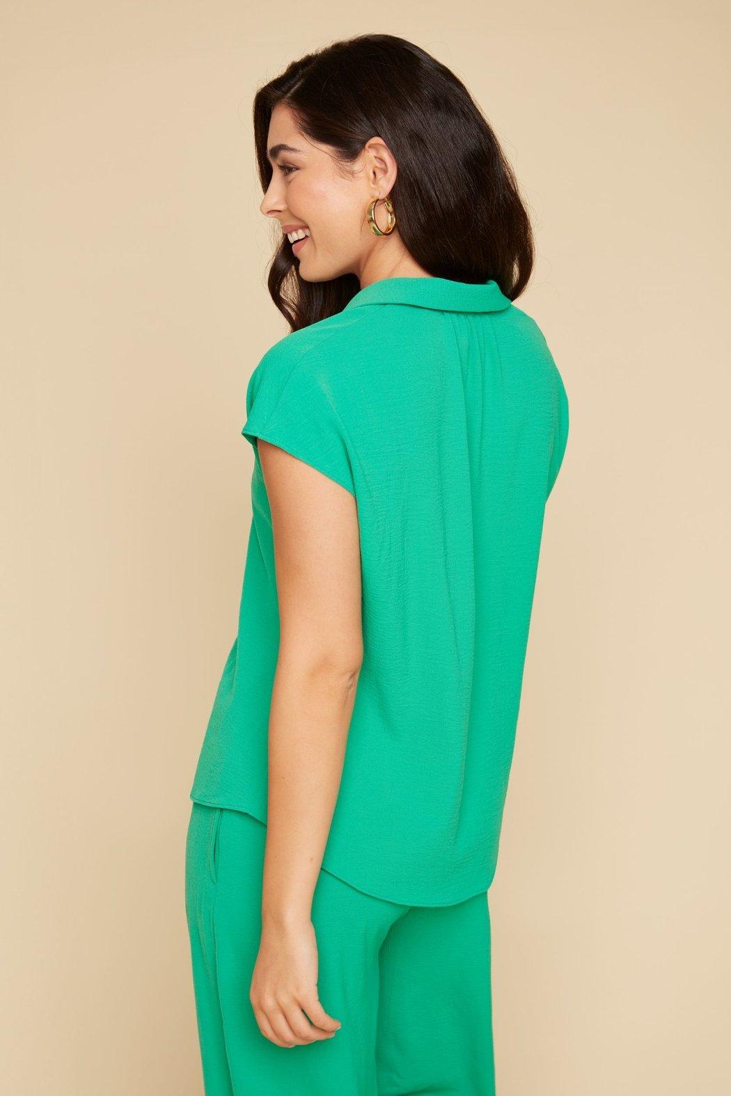 Elevate your wardrobe with the stunning jade Renuar Jaded Beauty Blouse! This button-up top features a flattering v-neck and collared design, as well as short dolman sleeves for a chic and effortless look. Perfect for any occasion, this blouse will add a pop of color and style to your ensemble.