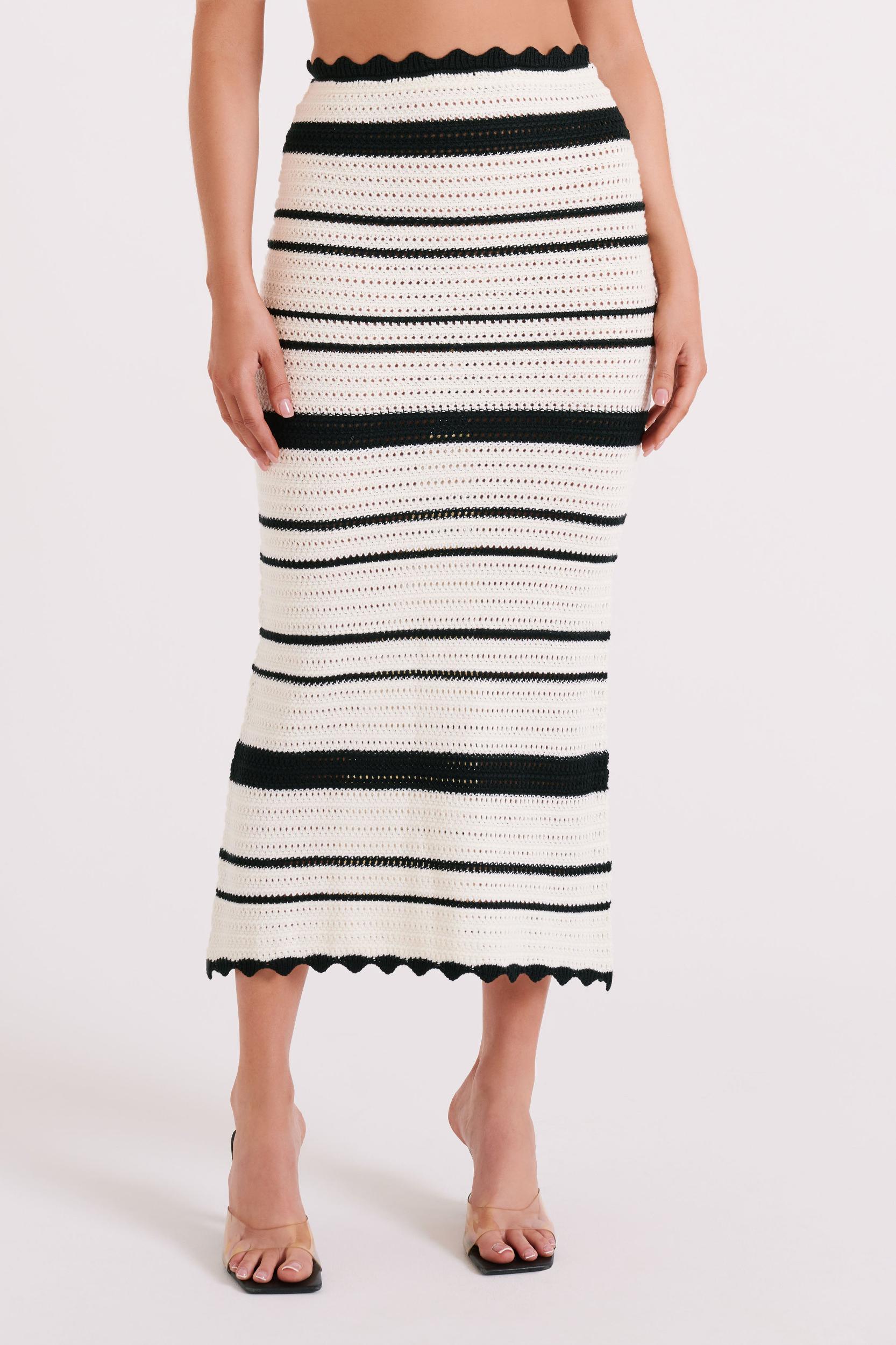 Throw a curve.The JADIA fishtail maxi skirt features an elasticated waist and body-hugging fit that accentuates the natural curve of the hips. This contrast crochet skirt, bordered with scalloped edges at the top, has a fitted high waistband that flows into a beautiful fishtail hem, all lined with bold stripes of differing weights from top to bottom. Match it with the Jadia Contrast Crochet Bralette to complete the look.