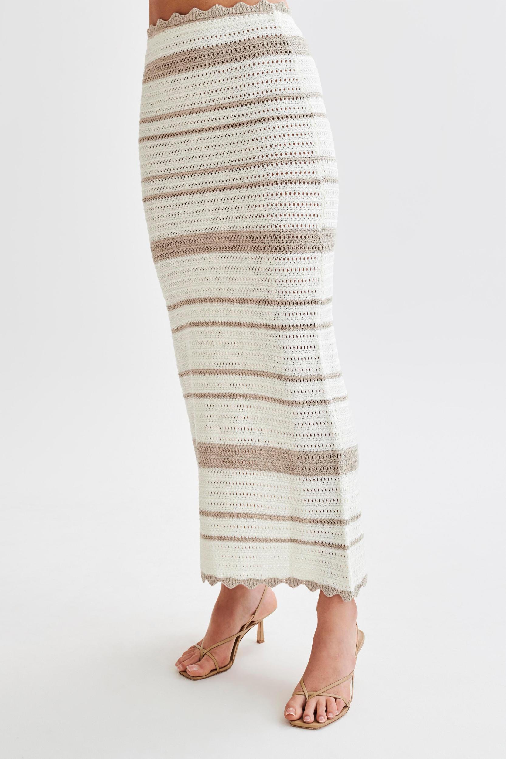 Throw a curve.The JADIA fishtail maxi skirt features an elasticated waist and body-hugging fit that accentuates the natural curve of the hips. This contrast crochet skirt, bordered with scalloped edges at the top, has a fitted high waistband that flows into a beautiful fishtail hem, all lined with bold stripes of differing weights from top to bottom. Match it with the Jadia Contrast Crochet Bralette to complete the look.