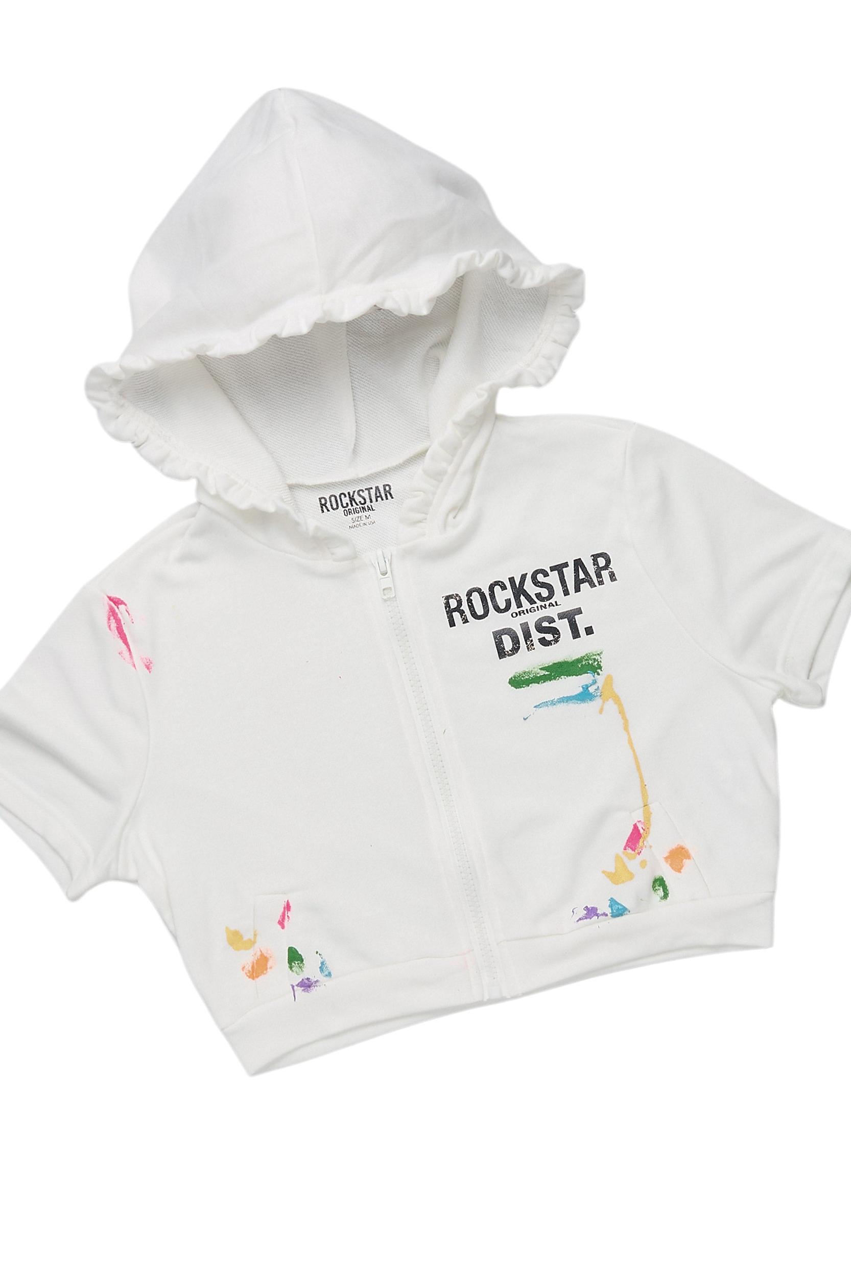 A cozy athleisure two-piece zip-up jacket and sweat short set for women in white. Designed with lightweight, butter soft fabric for the perfect lounge set. Hooded neckline Short sleeves Full front zip closure Relaxed-fit Cropped length Drawstring waistband Mini length Printed RSO logos Custom paint splatter