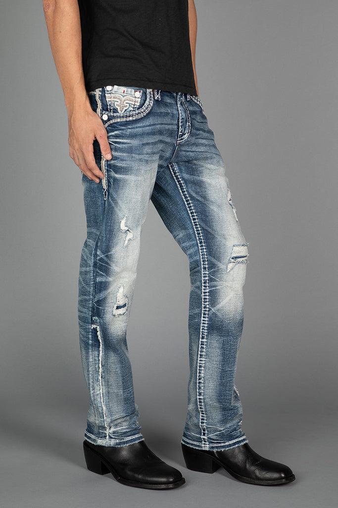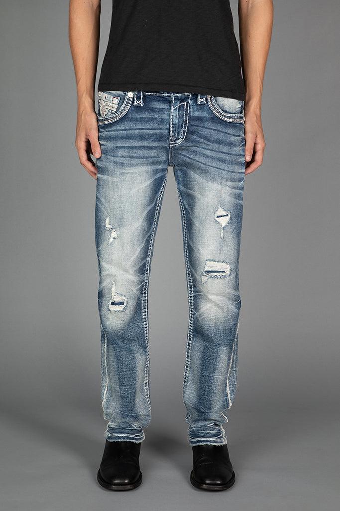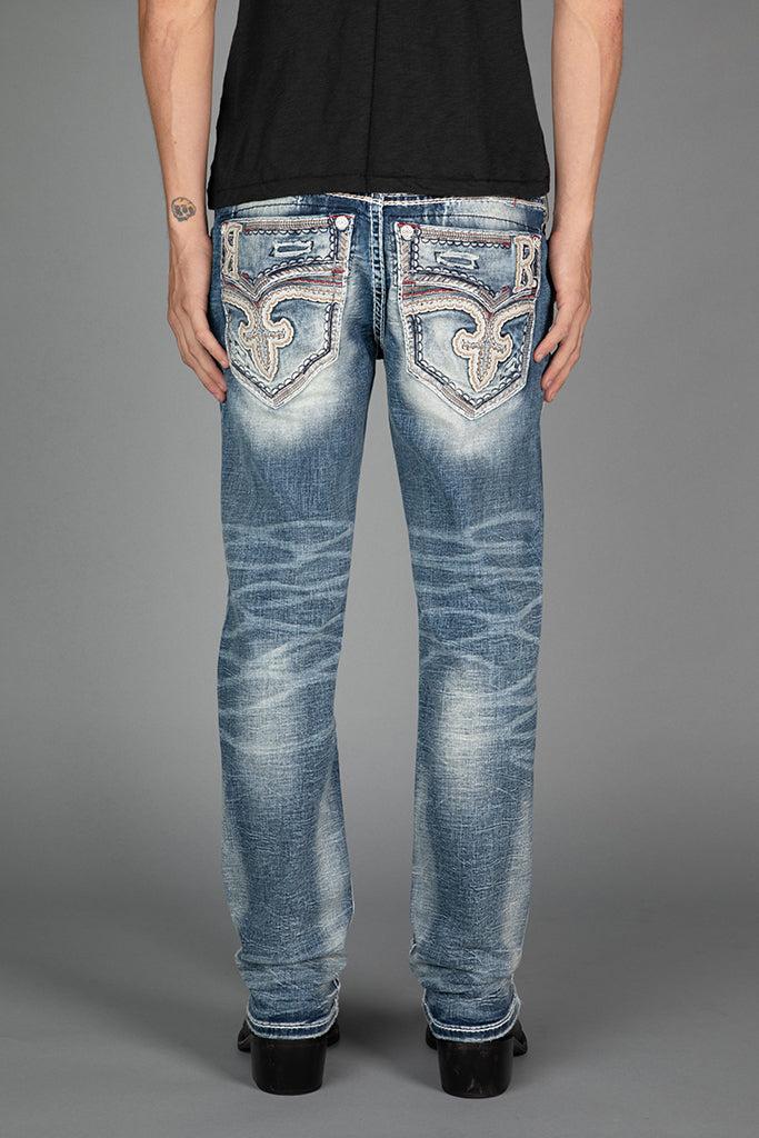Jakub Straight Jeans by Rock Revival with a straight silhouette crafted in a medium wash, designed in Los Angeles.