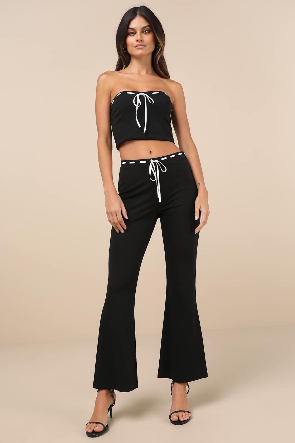 It's impossible not to admire the darling details of the Lulus Jalie Black Ribbon Mid-Rise Flare Pants! Sleek woven fabric shapes these effortlessly cute pants with a trending mid-rise fit, adorned with a contrasting, threaded ribbon detail that ties at the waist. The fitted pant legs continue to ankle-grazing, flared hems. Hidden side zipper. Pair with the matching top for a complete look!