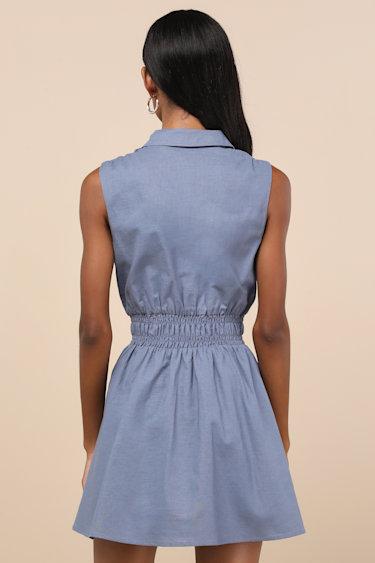 Clean girl chic and ready for a day of compliments, this linen-like summer dress features a breezy sleeveless silhouette with a cute collared neckline. The fitted bodice starts with a button placket that runs through the smocked banded waist and the adorable A-line mini skirt.