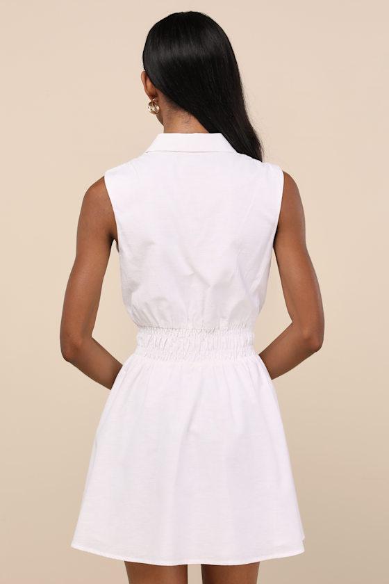 Clean girl chic and ready for a day of compliments, this linen-like summer dress features a breezy sleeveless silhouette with a cute collared neckline. The fitted bodice starts with a button placket that runs through the smocked banded waist and the adorable A-line mini skirt.