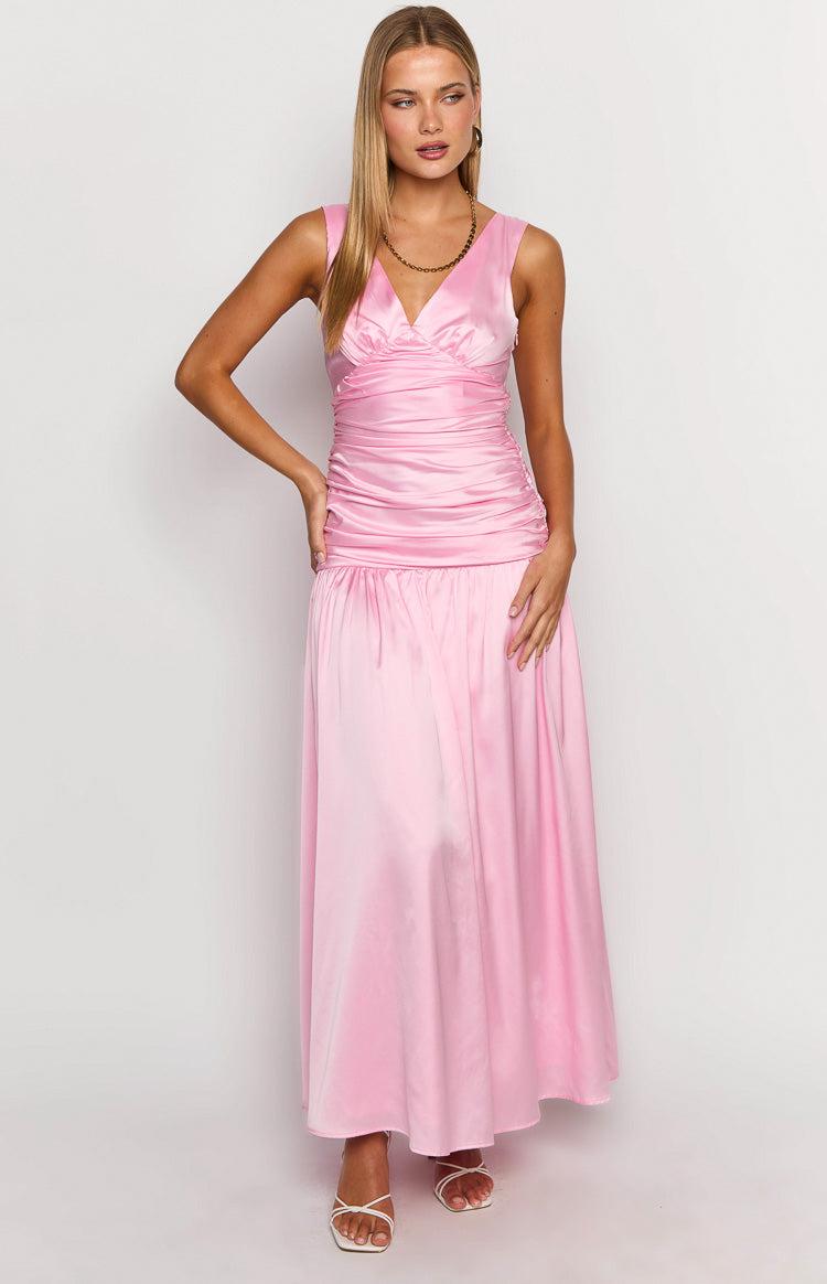 Pink Satin Maxi DressHow to Style:The Jalyn Pink Gathered Maxi Dress is a stunning choice for a romantic evening or formal event! Pair with strappy silver heels, delicate drop earrings, and a chic clutch for an elegant look.Features: Deep V-neckline Gathered detailing through body Flowing maxi skirt Lightweight satin material Fully lined Invisible side zipper Little to no stretch