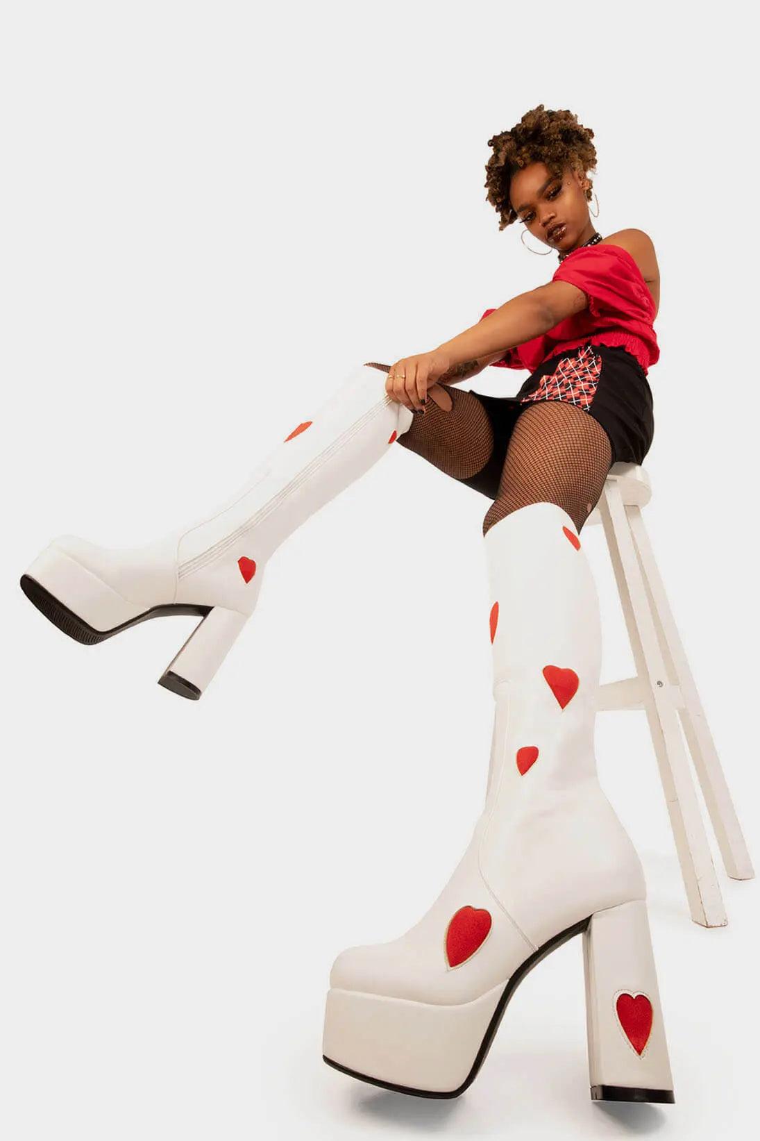 THE ONE FROM INSTA'Jam Tarts Platform Knee High Boots in White faux leather. These White vegan Boots feature our ICONIC Red faux suede hearts and Platform sole and heel, perfect for adding height and style to any outfit. Made with eco-friendly materials and 100% cruelty-free, these boots are as ethical as they are cute!- Platform Height: 1.25 inch- Heel Height: 4.2 inch- Knee High length- Red Hearts- White zipper - Platform sole- Round Toe- 100% vegan SKU: LMF 0916 - White/RedHeart