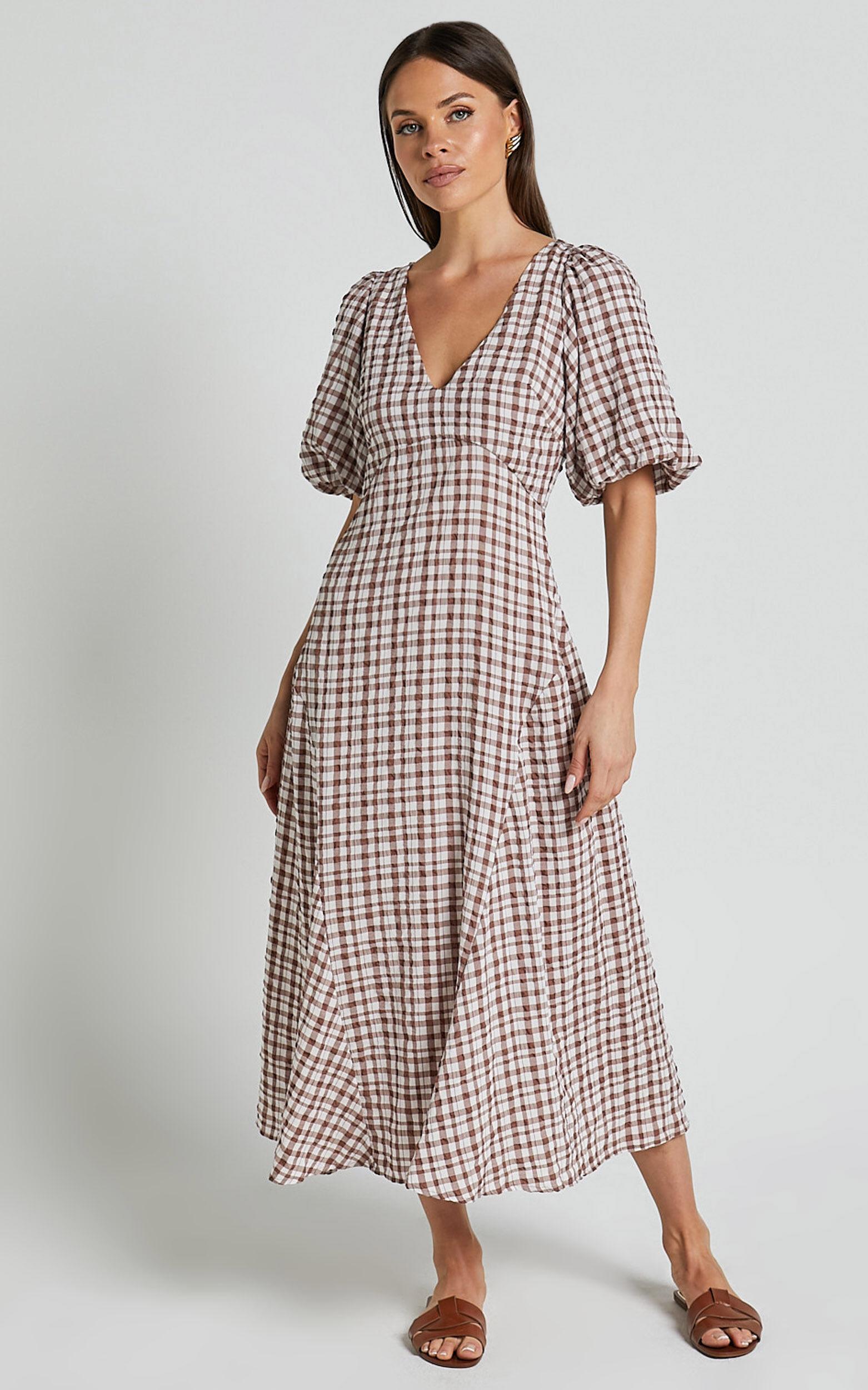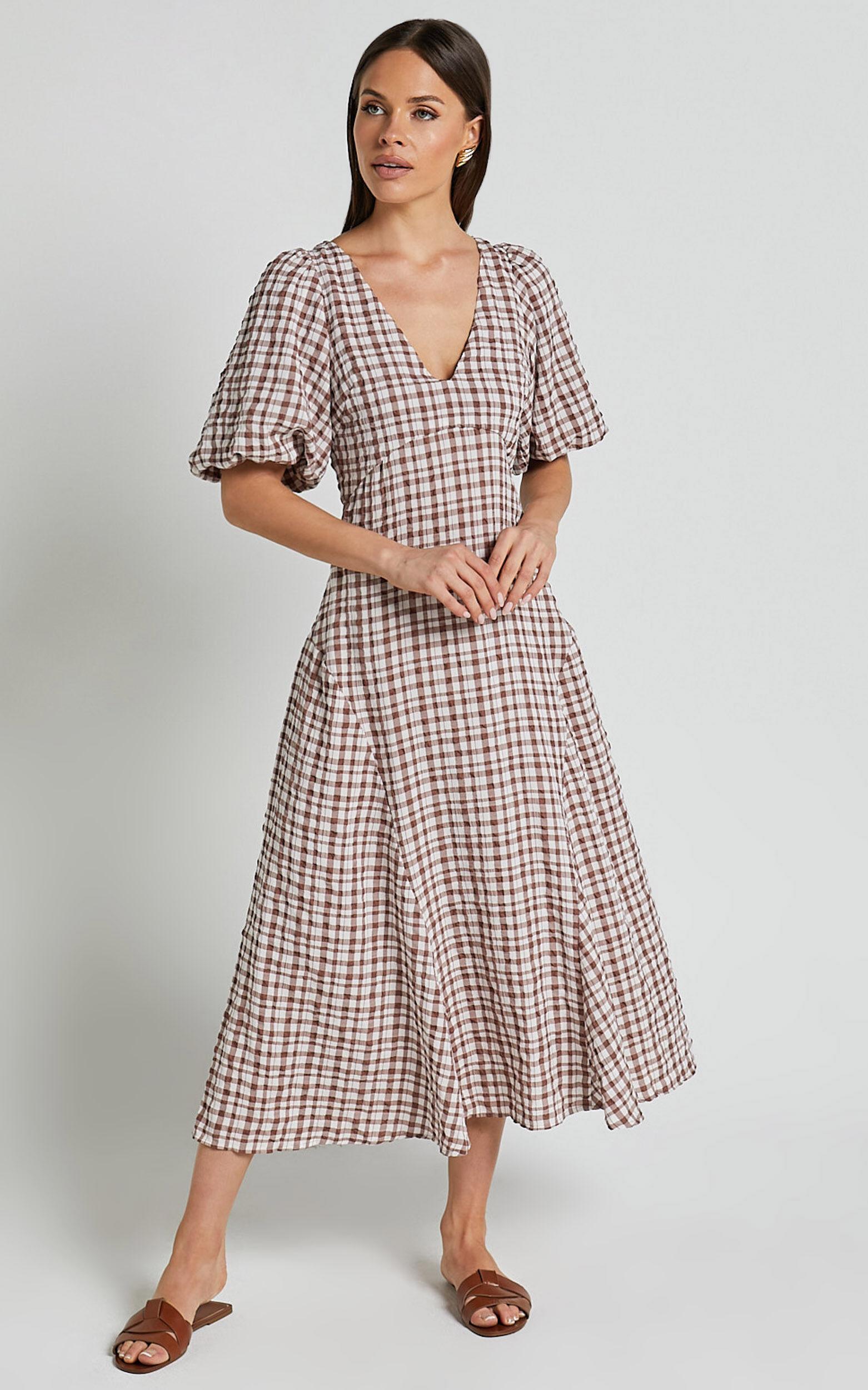 Get ready to turn heads in the Jameela Midi Dress! This gorgeous A-line smock dress features a flattering v-neckline and trendy short puff sleeves, perfect for adding a touch of femininity to your look. Made from soft and breathable rayon fabric, this chocolate gingham dress is as comfortable as it is stylish. Whether you're heading out for brunch with friends or attending a casual event, this midi dress will make you feel effortlessly chic and confident. Embrace your individuality and embrace the power of fashion with the Jameela Midi Dress from Showpo!Product Details:A-line dressV-necklineMidi lengthShort sleevesMade of rayon fabricSuitable for casual wearZips closureSize and FitSize S / 8 length: 124cm / 48.82inMaterial and CareMain Fabric: 62% Rayon, 38% Nylon Lining: 100% CottonNo Stretch