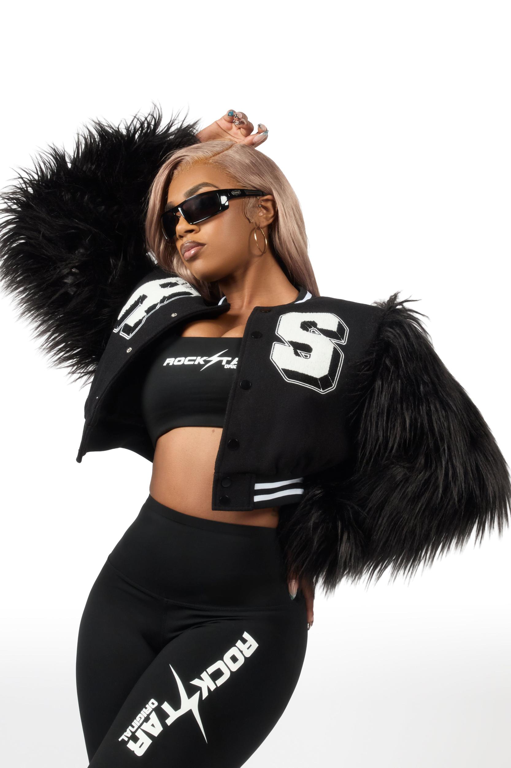 An urban cropped varsity jacket for women in black. Designed with custom detailing and soft fur fabric for the perfect versatile layering piece. Rounded neckline Full front snap button closure Custom chenille patchwork Custom RSO logos Faux fur fabric Ribbed knit trims Custom RSO logos Cropped length