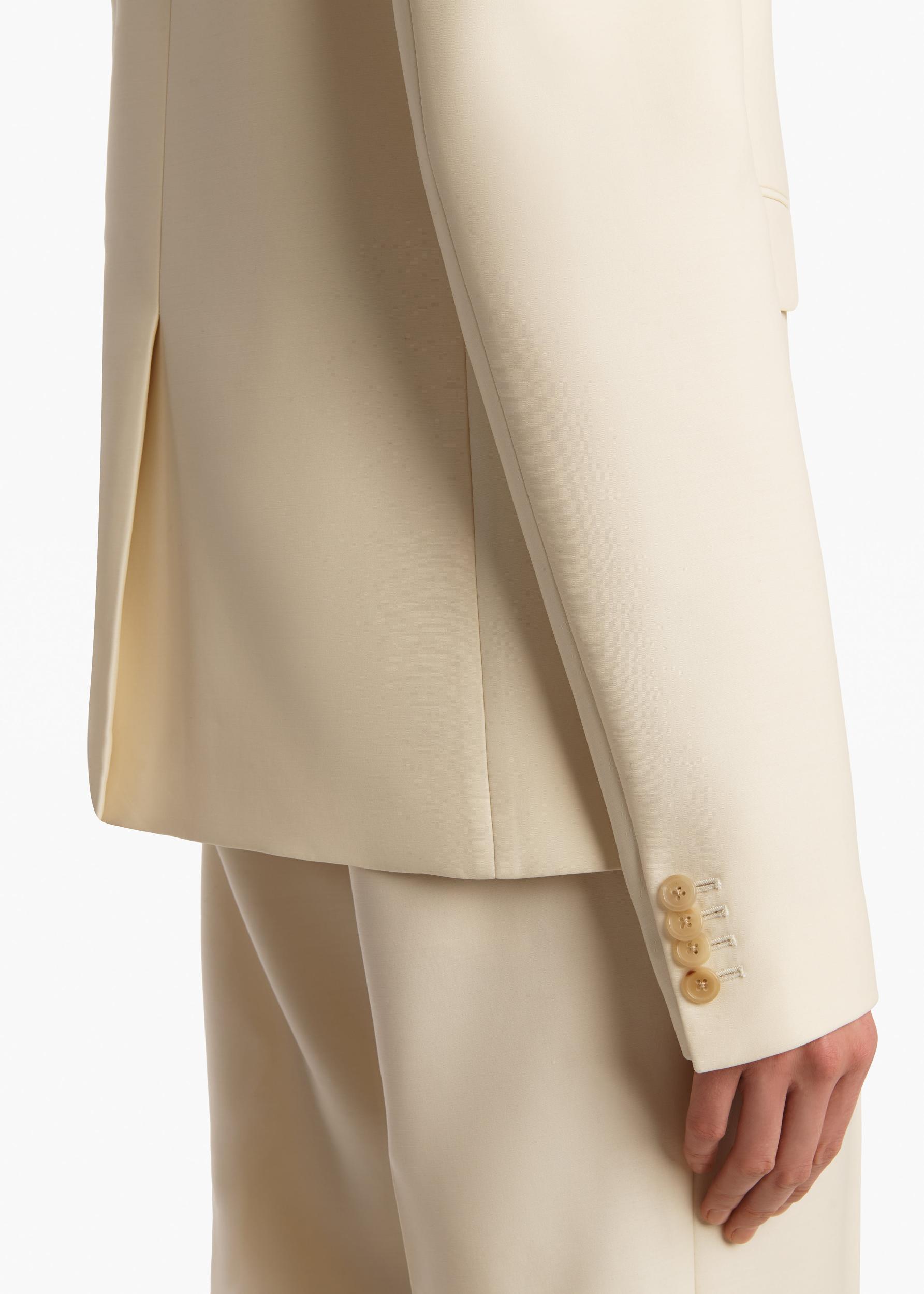 Tailored ease in richly textured faille. A collarless silhouette of clean lines and refined details. Diagonal shoulder seams, subtle shoulder pads, welted flap pockets, and tonal buttons at placket and cuffs. Lined in silky cupro twill.